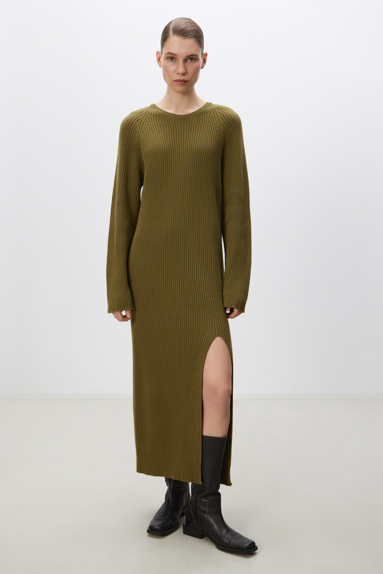 Knitted dress made of a wool blend with the addition of cashmere. Features loose silhouette with a wide rib with a front slit and dropped shoulder line.