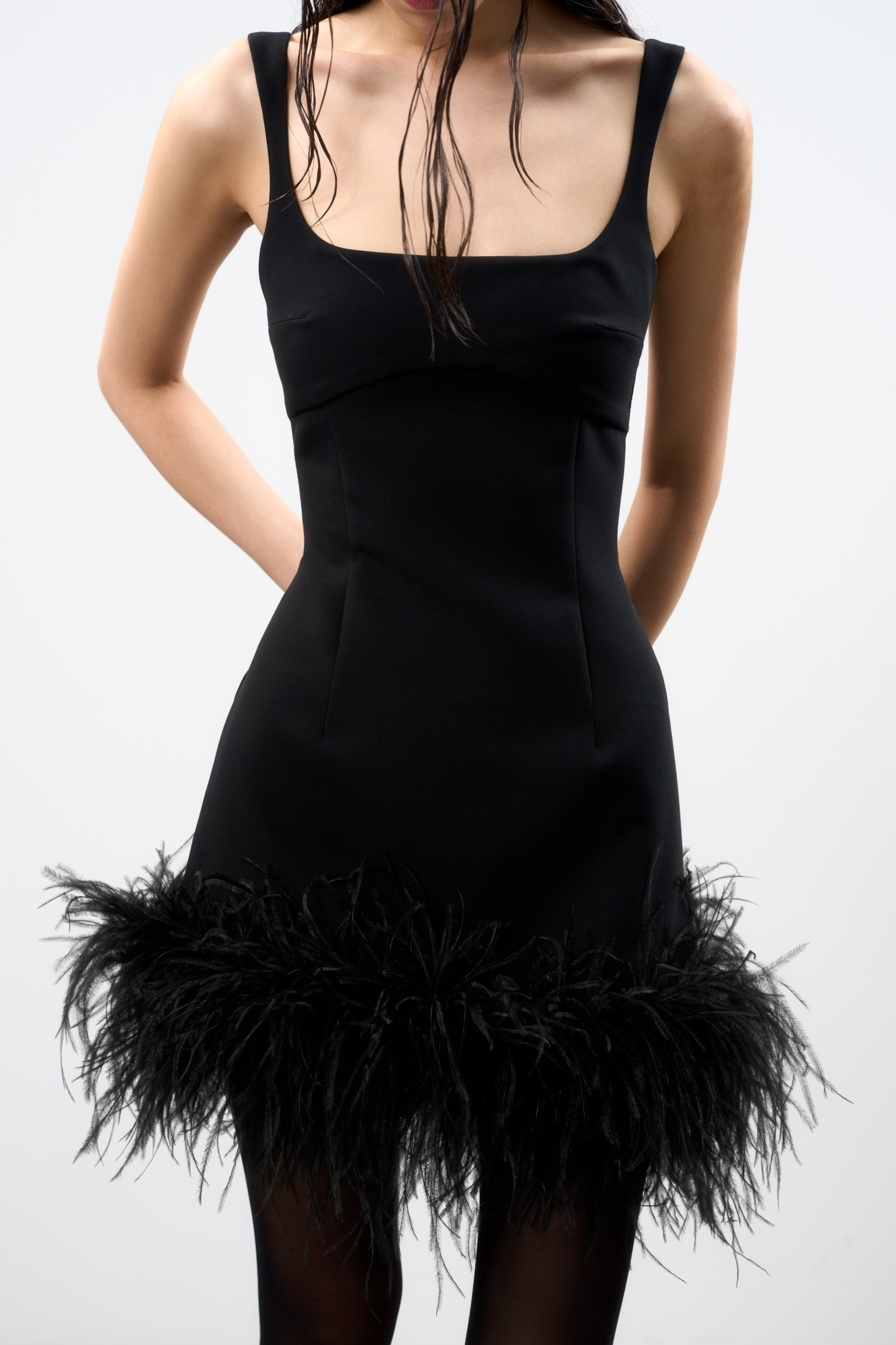 Poly viscose mini dress. Fitted silhouette with feathers at the hem.