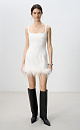 Poly viscose mini dress. Fitted silhouette with feathers at the hem.