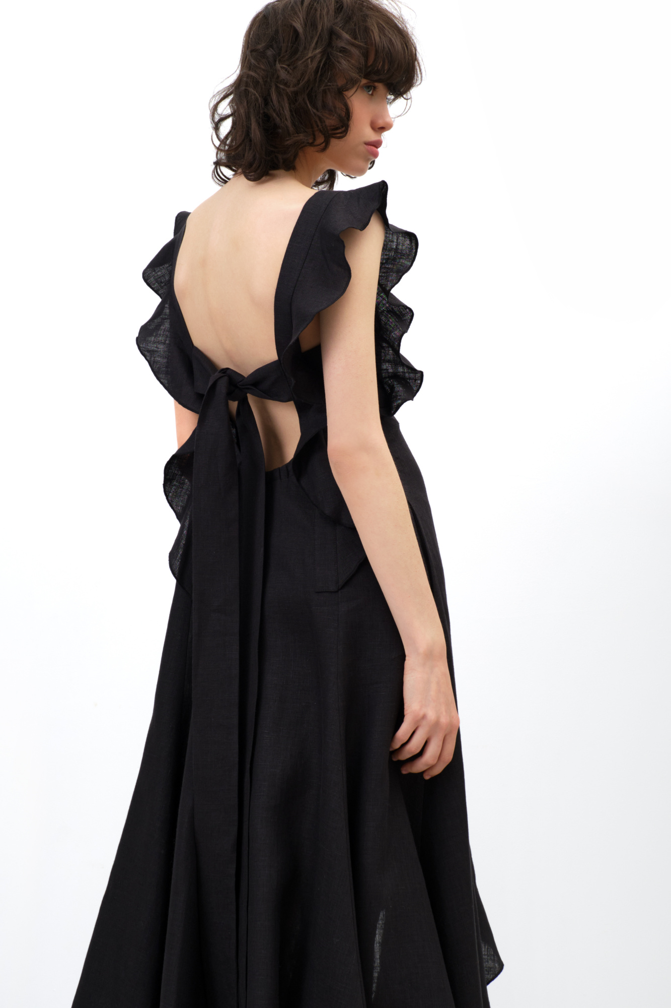 Linen maxi sundress with an open back, ruffles on the sleeves and skirt.