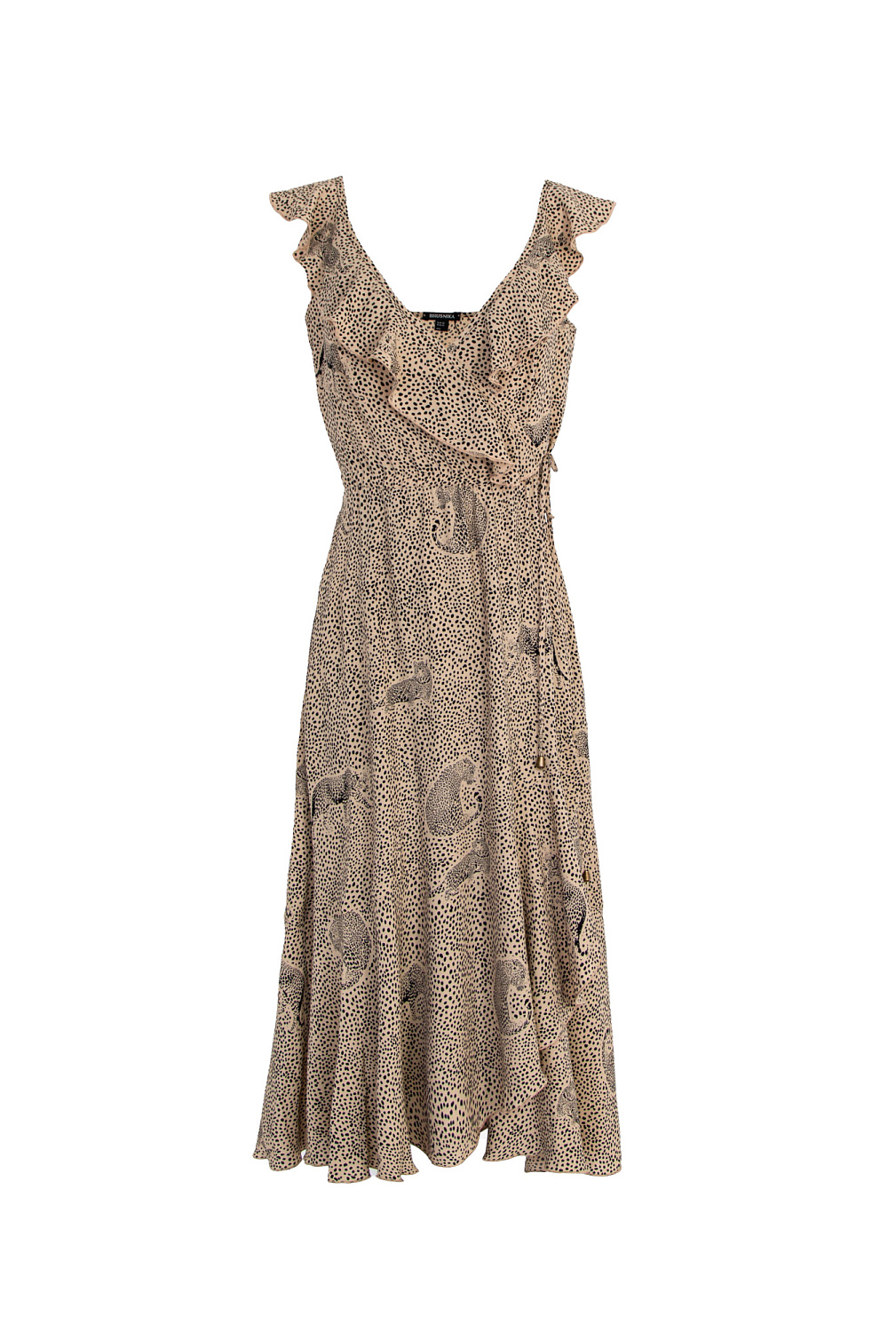 Polka dot wrap sundress in 100% viscose. Features a V-neck and asymmetrical hem.
