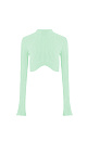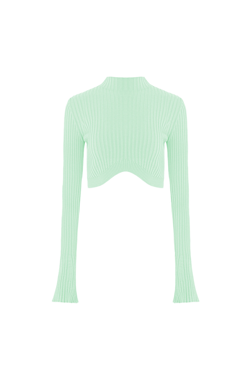 Ribbed knit top with long sleeves and a curved hem. You can combine the look with a skirt in the same style.