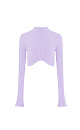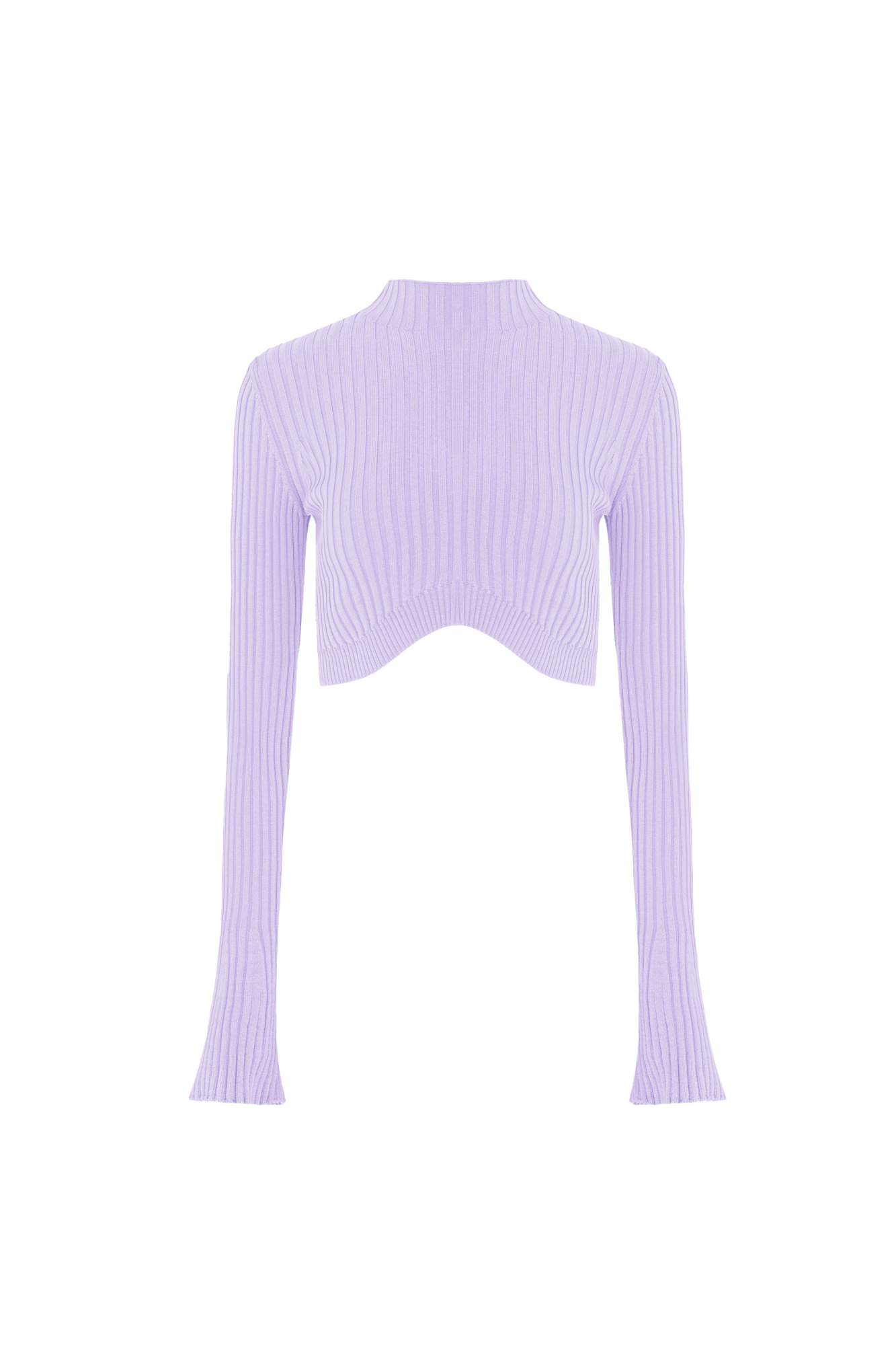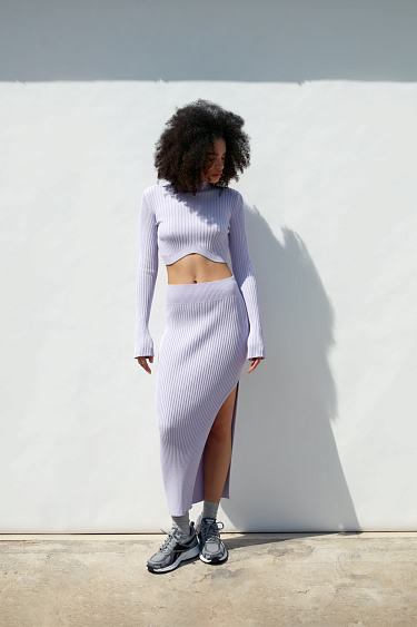 Ribbed knit top with long sleeves and a curved hem. You can combine the look with a skirt in the same style.