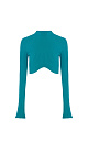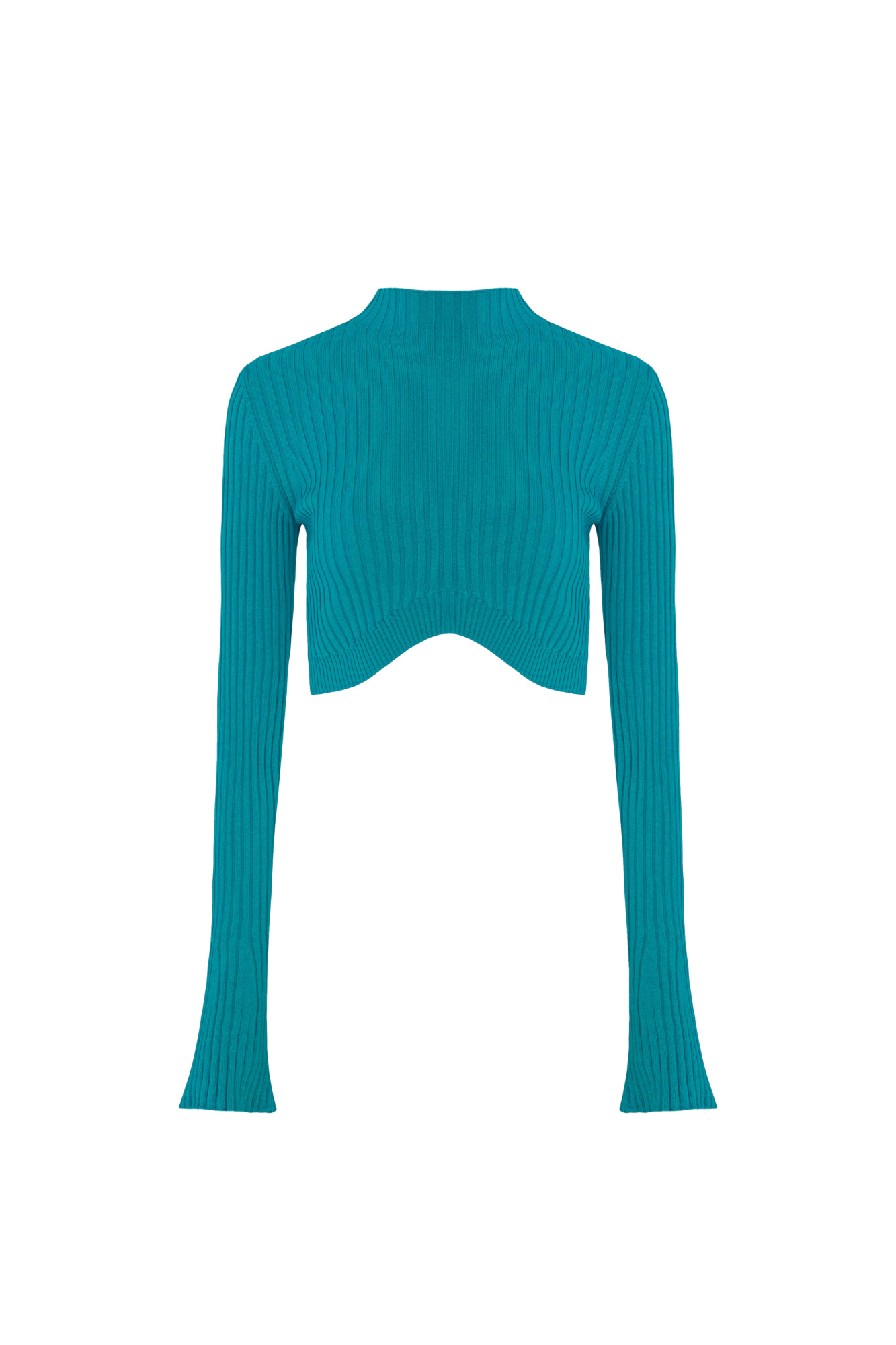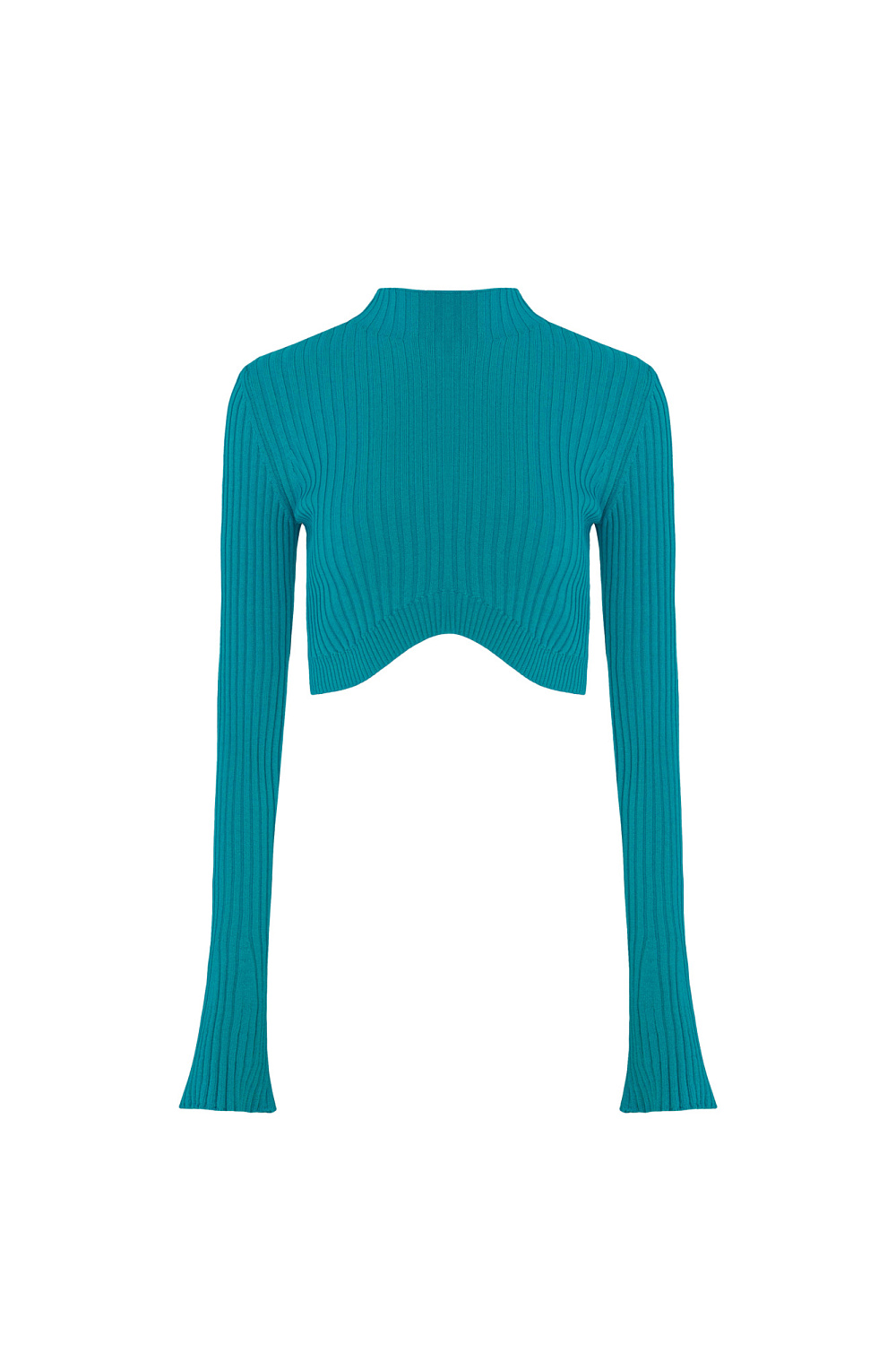 Ribbed knit top with long sleeves and a curved hem. You can combine the look with a skirt in the same style.