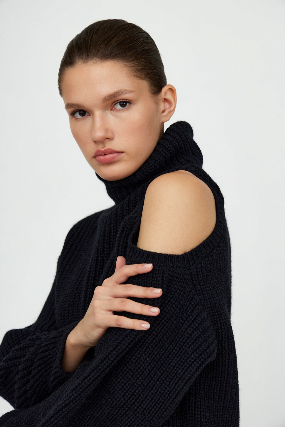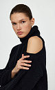 Alpaca wool blend jumper with cut-out shoulder and high collar.