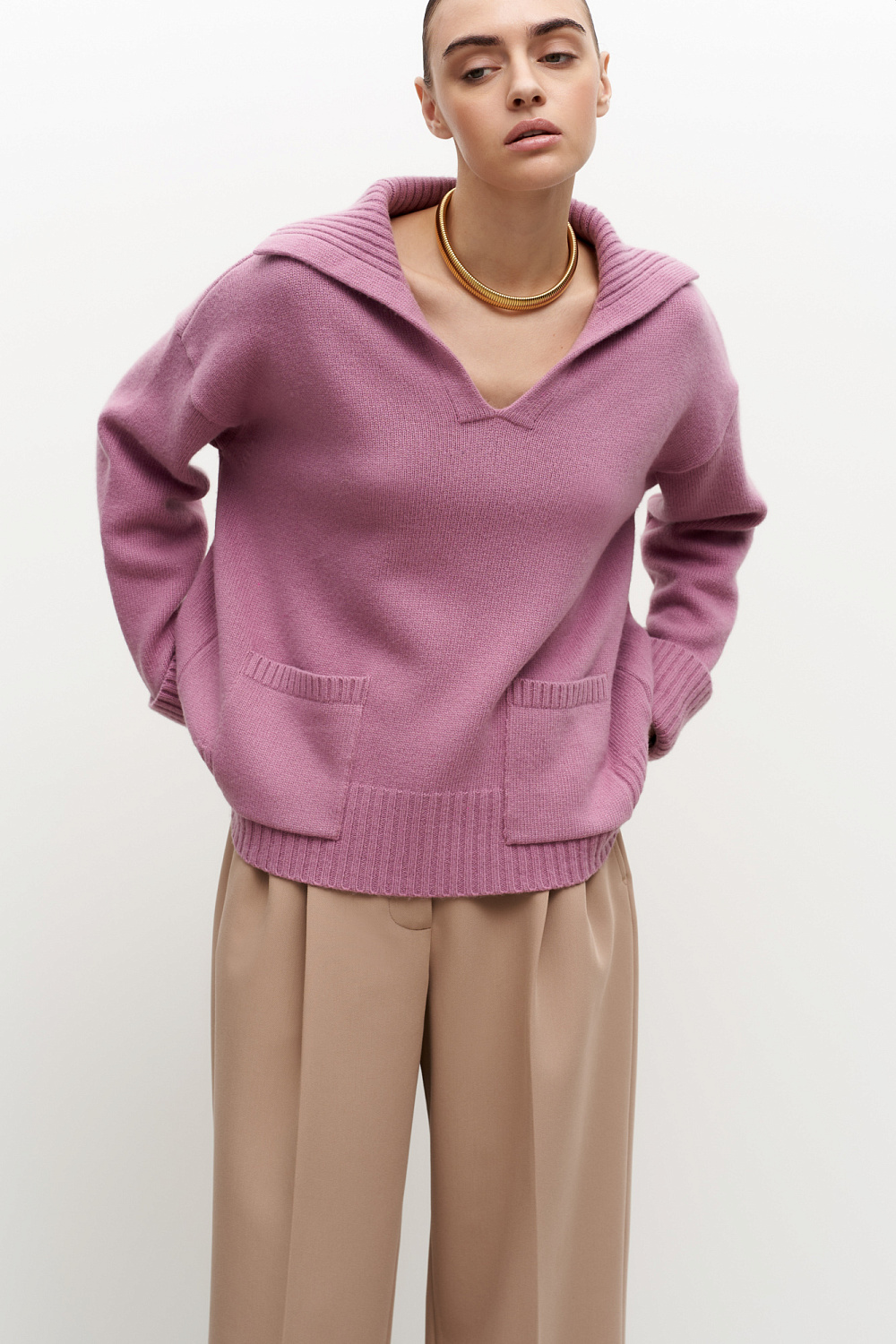 Wool blend knit jumper with V-neck, turn-down collar and patch pockets. Loose silhouette.