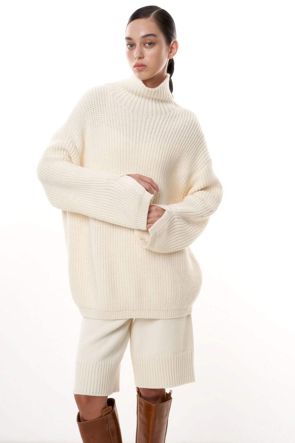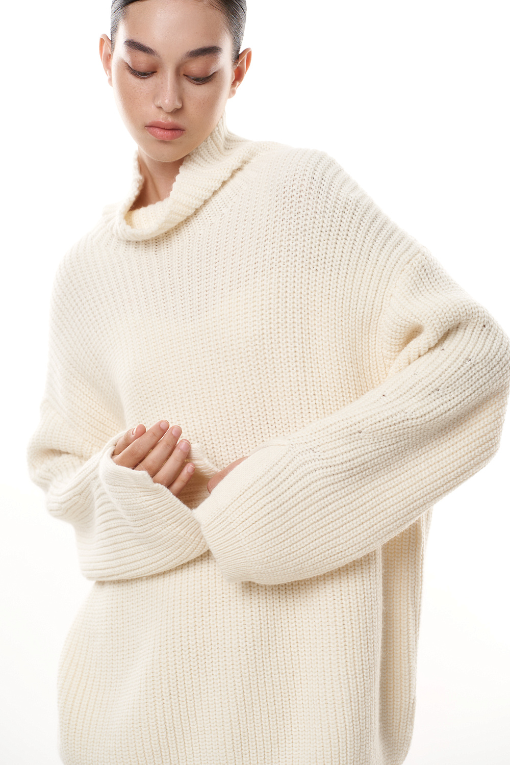Alpaca wool knit jumper. Loose silhouette with a dropped shoulders, a high collar and slits at the cuffs.