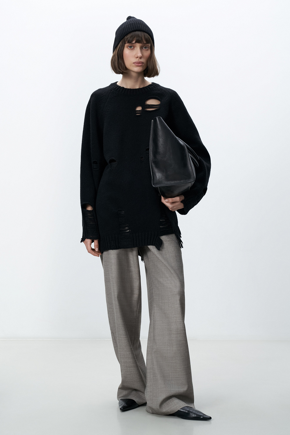 Merino wool knit jumper. Oversized silhouette with a dropped shoulders and ripped texture.