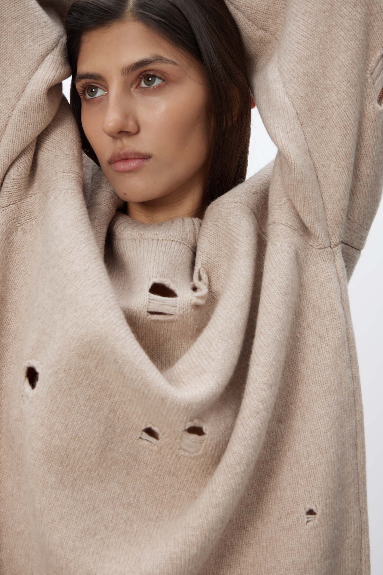 Merino wool knit jumper. Oversized silhouette with a dropped shoulders and ripped texture.