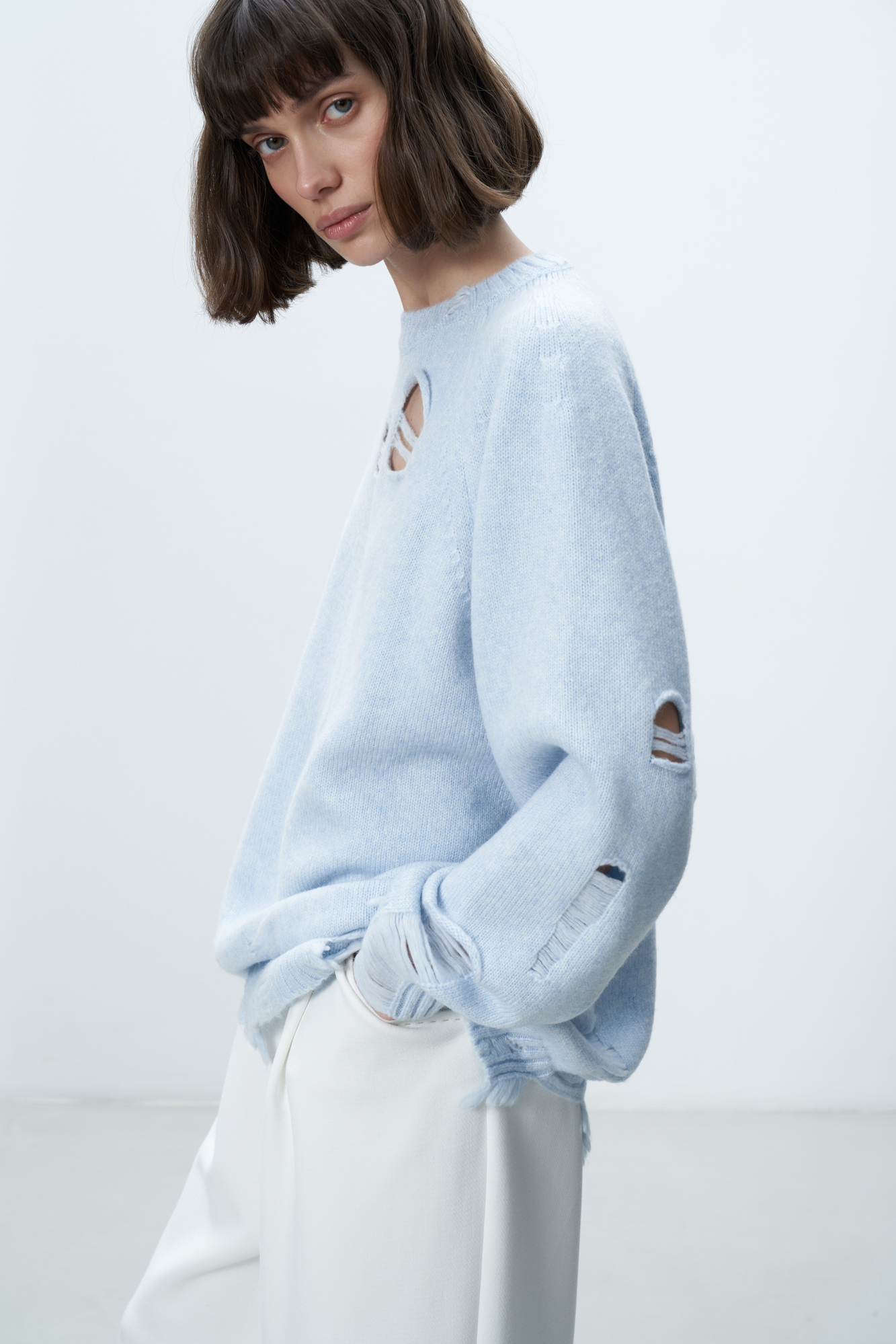 Merino wool knit jumper. Oversized silhouette with a dropped shoulders and ripped texture.