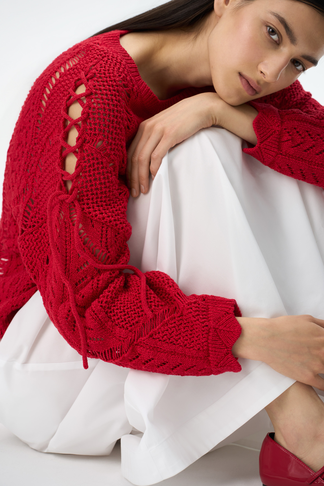 Loose openwork jumper with lacing on the sleeves and dropped shoulders.
