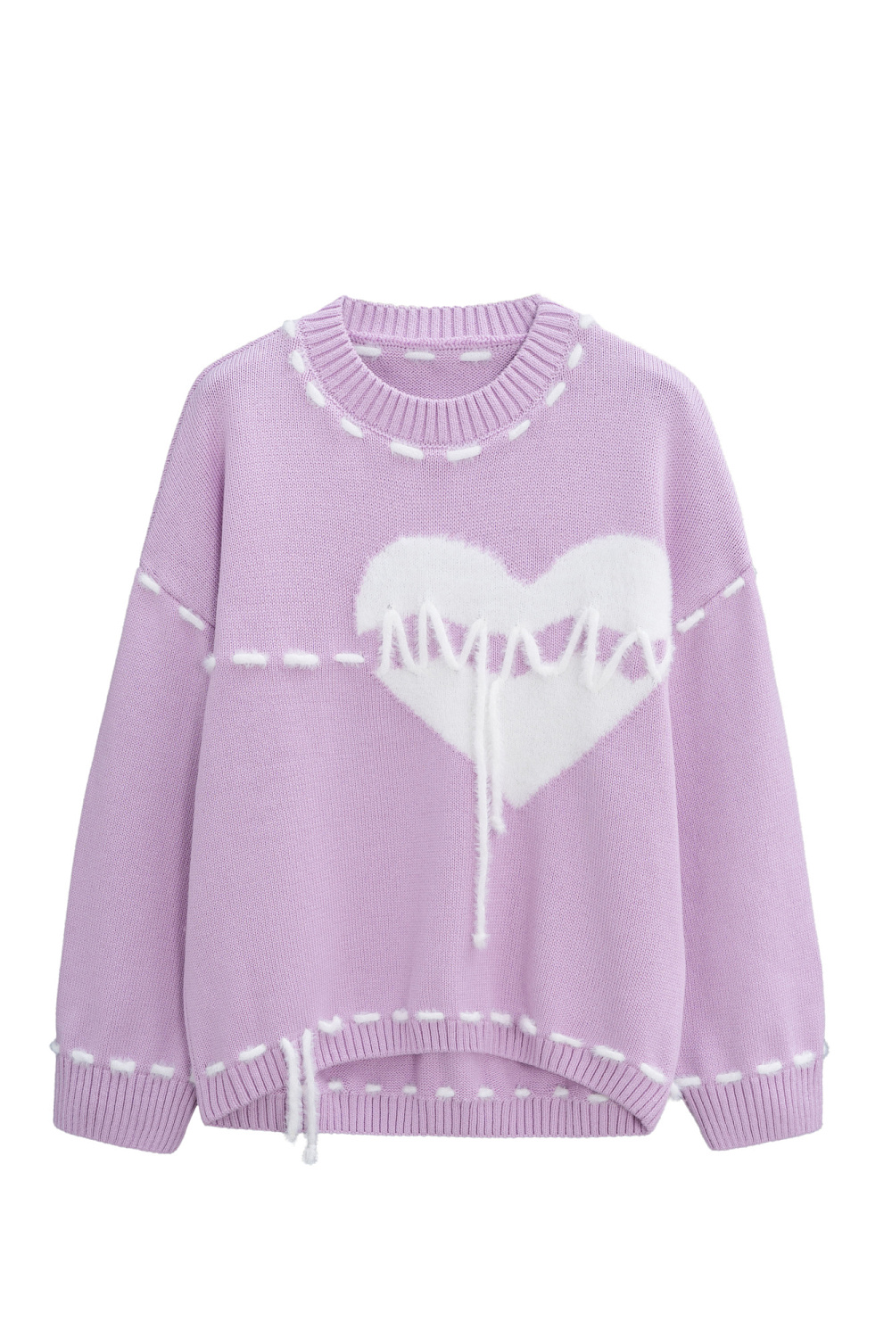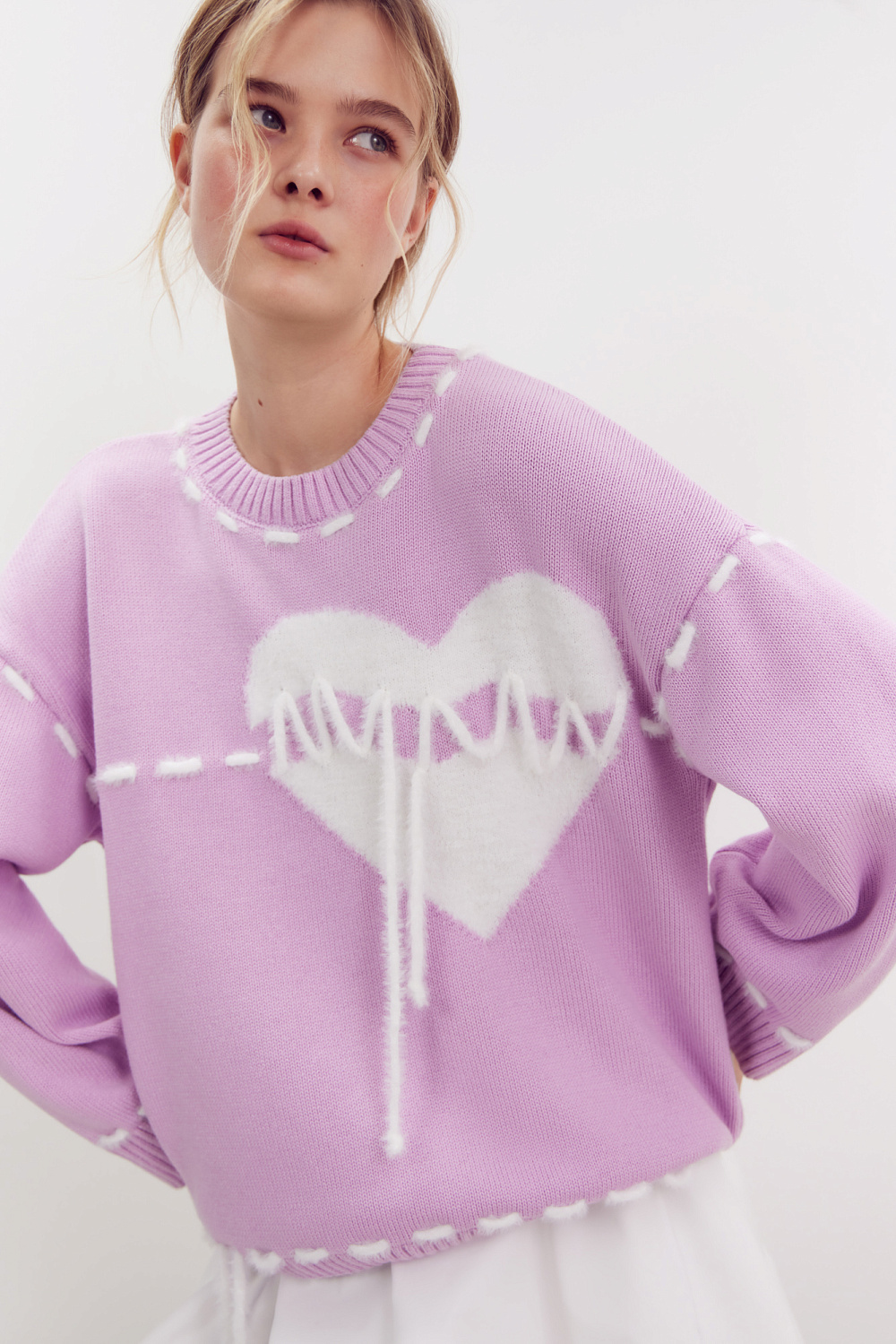 Cotton knitted jumper. Loose fit model with dropped shoulders and round neckline. The product is decorated with a large knitted heart and contrasting white stitching imitating hand stitches.