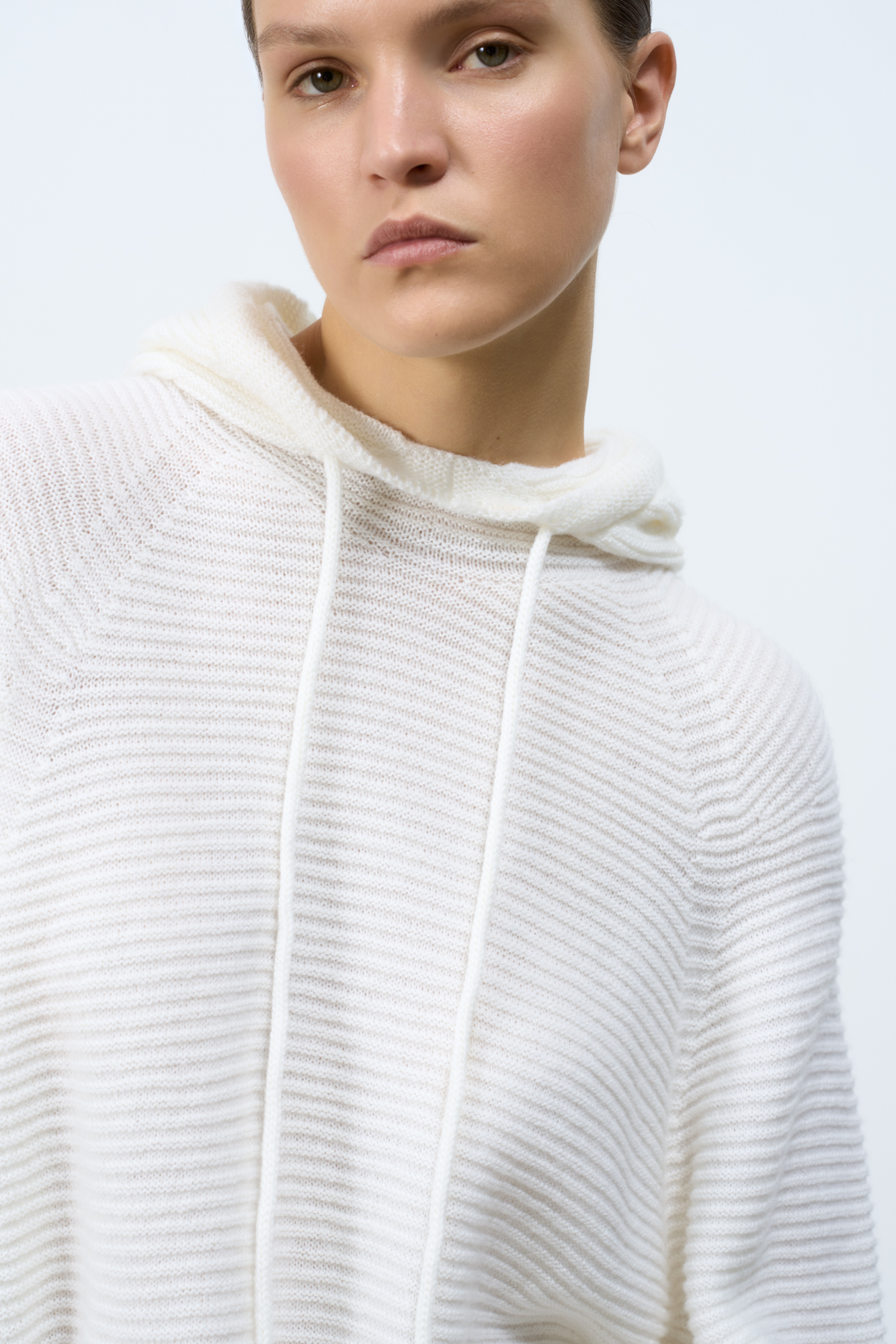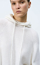 Wool blend knit jumper. Loose silhouette with a dropped shoulders and a hood with a drawstring. Ribbed edges.