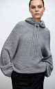 Wool blend knit jumper. Loose silhouette with a dropped shoulders and a hood with a drawstring. Ribbed edges.