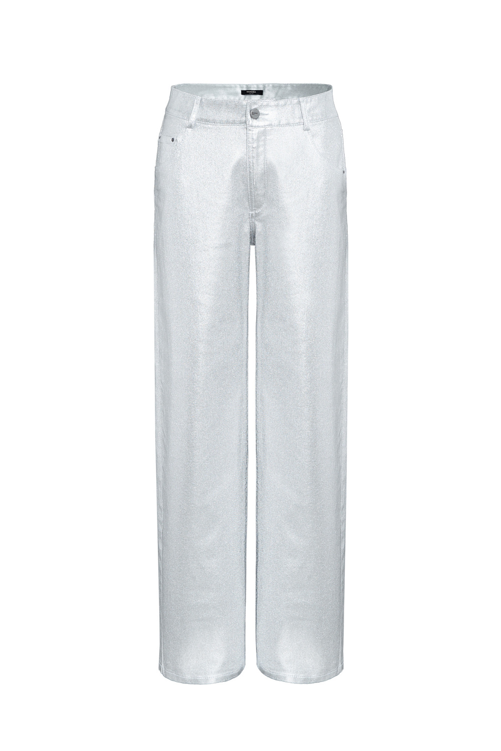 Metallic coated jeans. Mid-rise model. Five pockets, zipper and metal button closure.