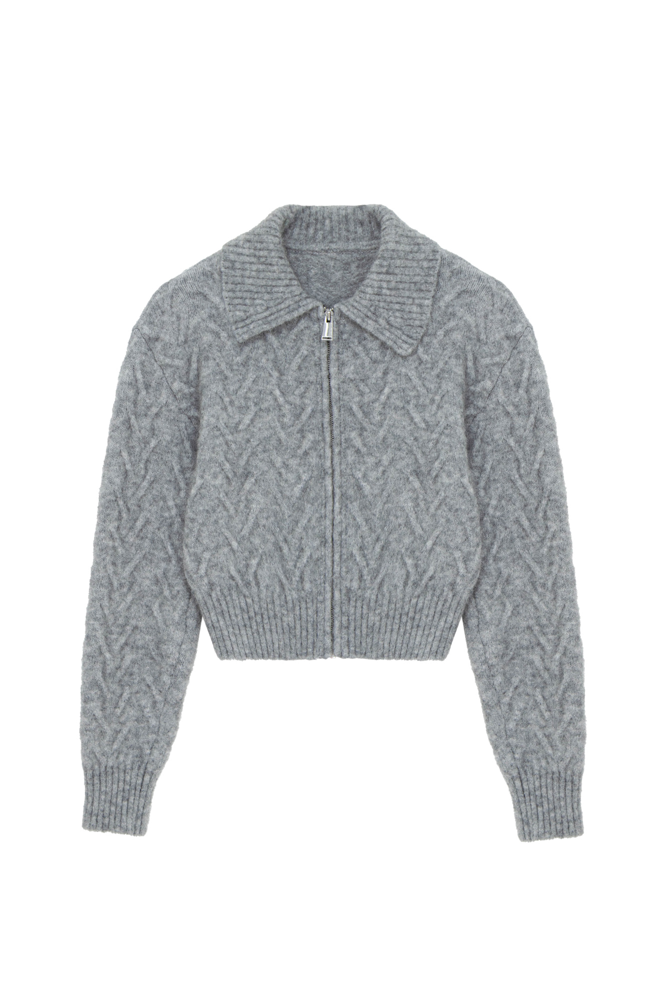 Knitted alpaca wool blend bomber jacket. Turn-down collar, long sleeves with elastic ribbed cuffs. Zip closure.