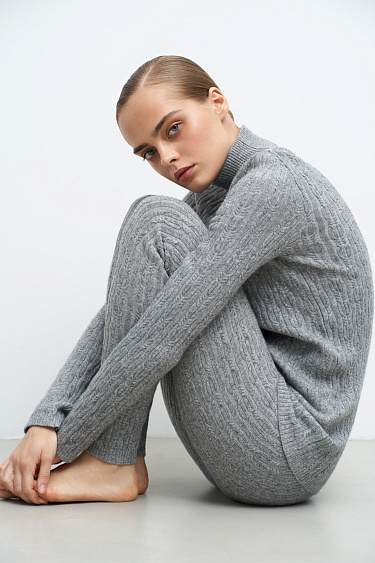 Knitted cardigan with a high stand-up collar, long sleeves and zip closure. For production, fine wool was used with the addition of delicate cashmere.