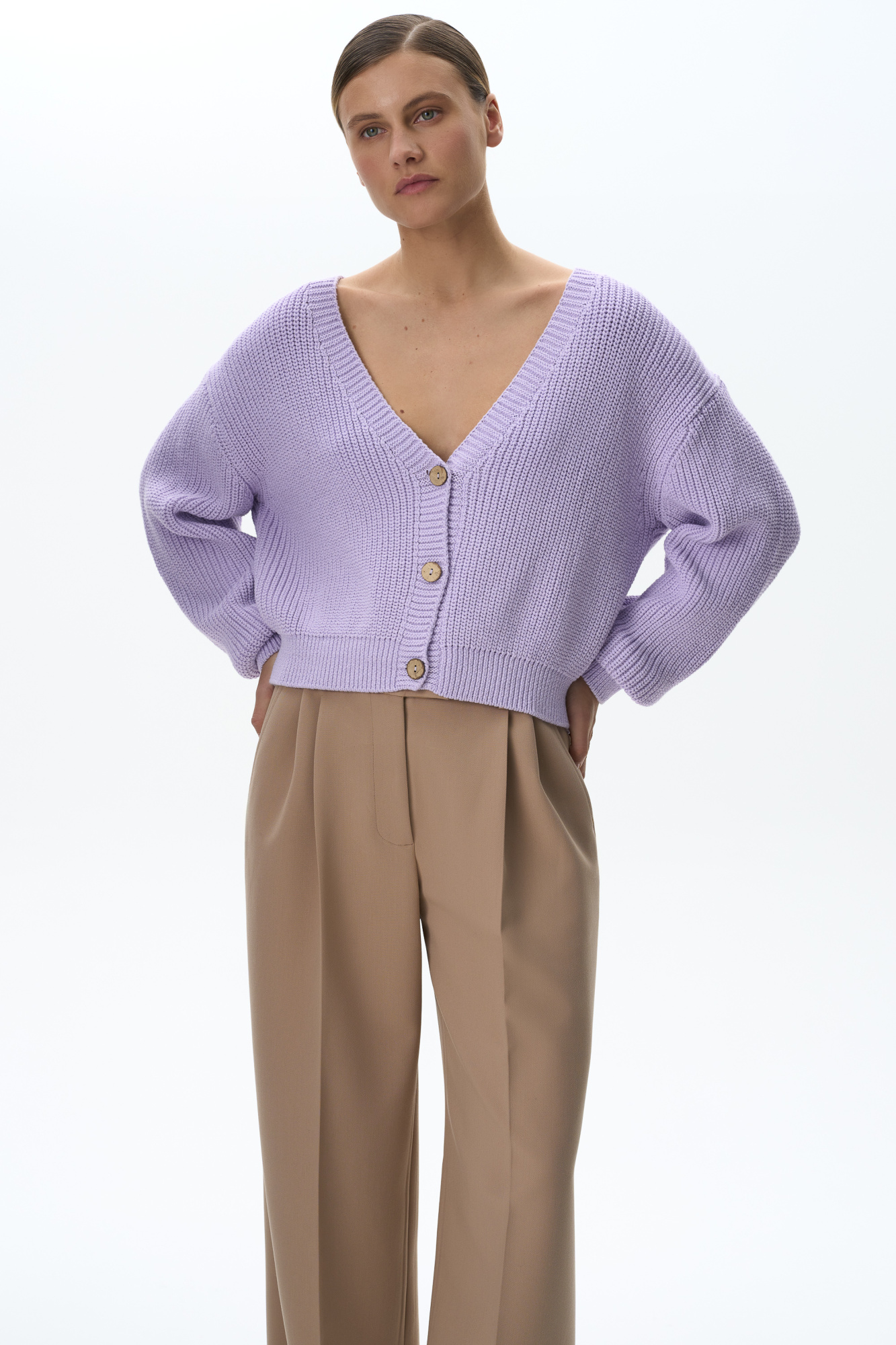 Cotton cardigan with long sleeves. V-neck, ribbed hem and cuffs.