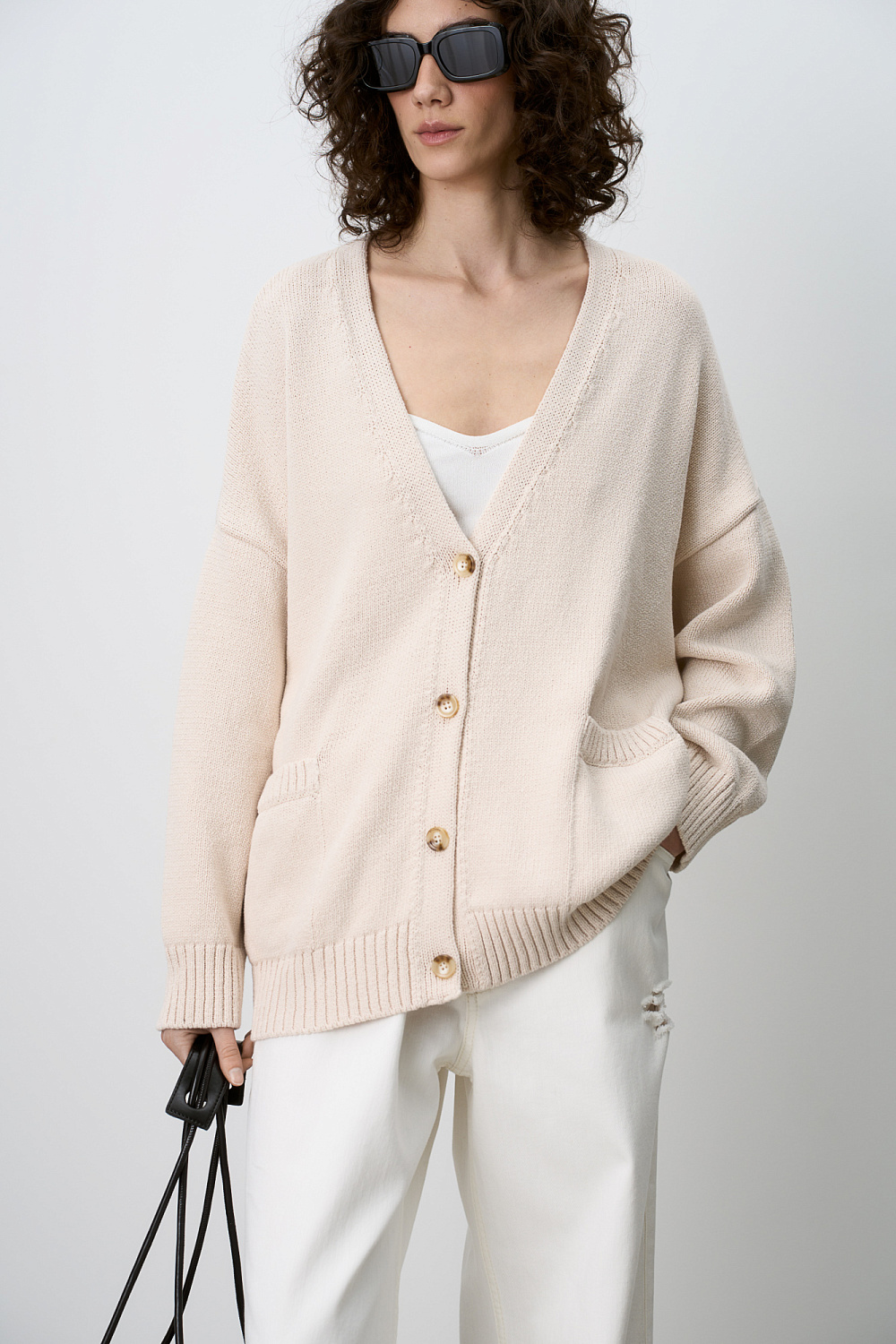 Basic 100% cotton cardigan with dropped sleeves and V-neck. Wide ribbed cuffs and hem.