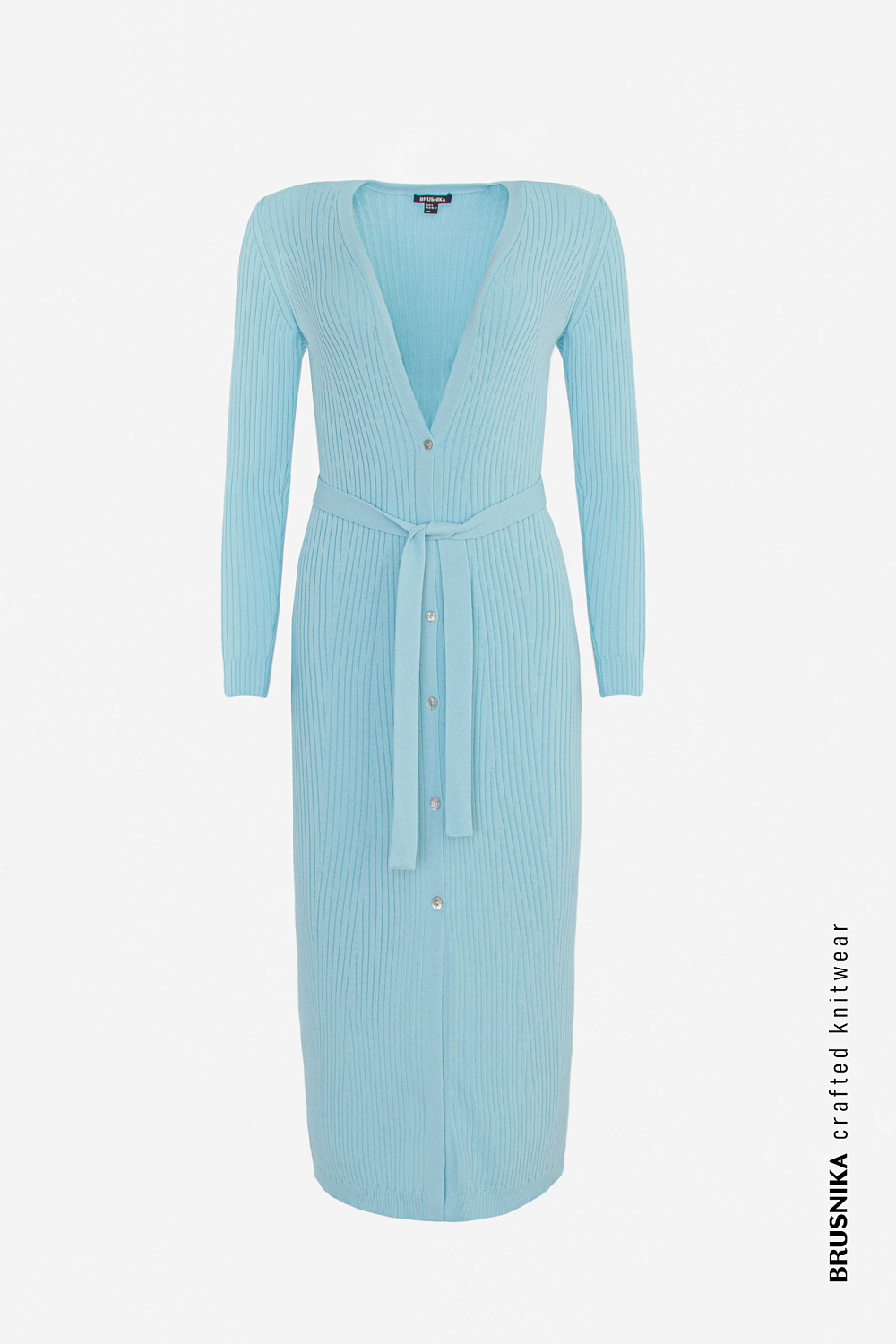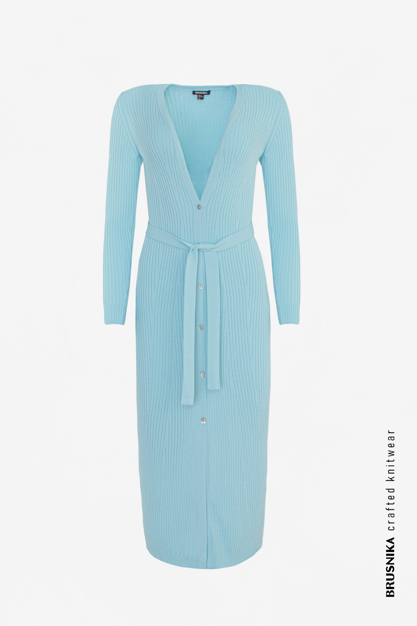 Long ribbed knit cardigan with tie belt and button closure.