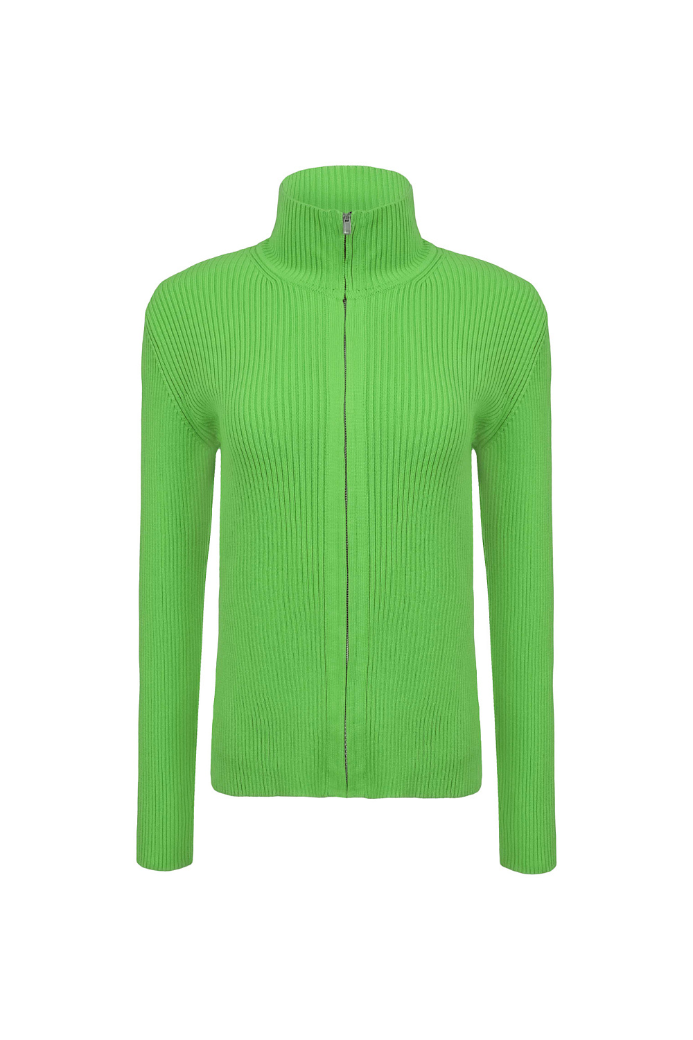 100% cotton ribbed knit cardigan featuring stand-up collar and zip fastening.