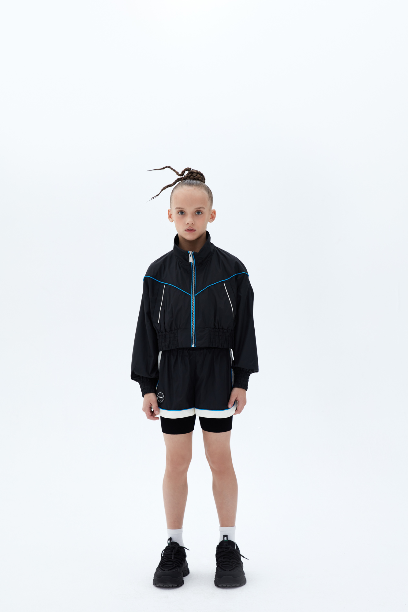 A cropped children's bomber jacket in a sporty style with pockets on the sides and blue piping. Cuffs and hem with elastic band. Lining with mesh elements on the sides. You can complement the look with shorts in the same style.