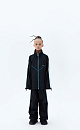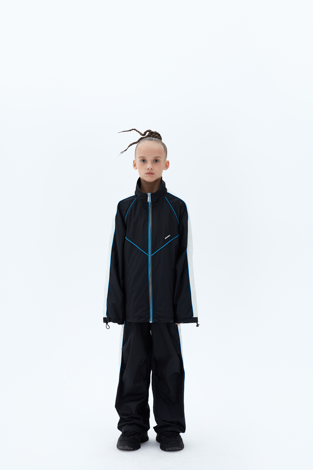 Children's jacket in a sporty style with pockets on the sides, blue piping and wide stripes. Branded label on the chest. Lined with mesh on the sides and a stand-up collar. You can complement the look with trousers or shorts in the same style.