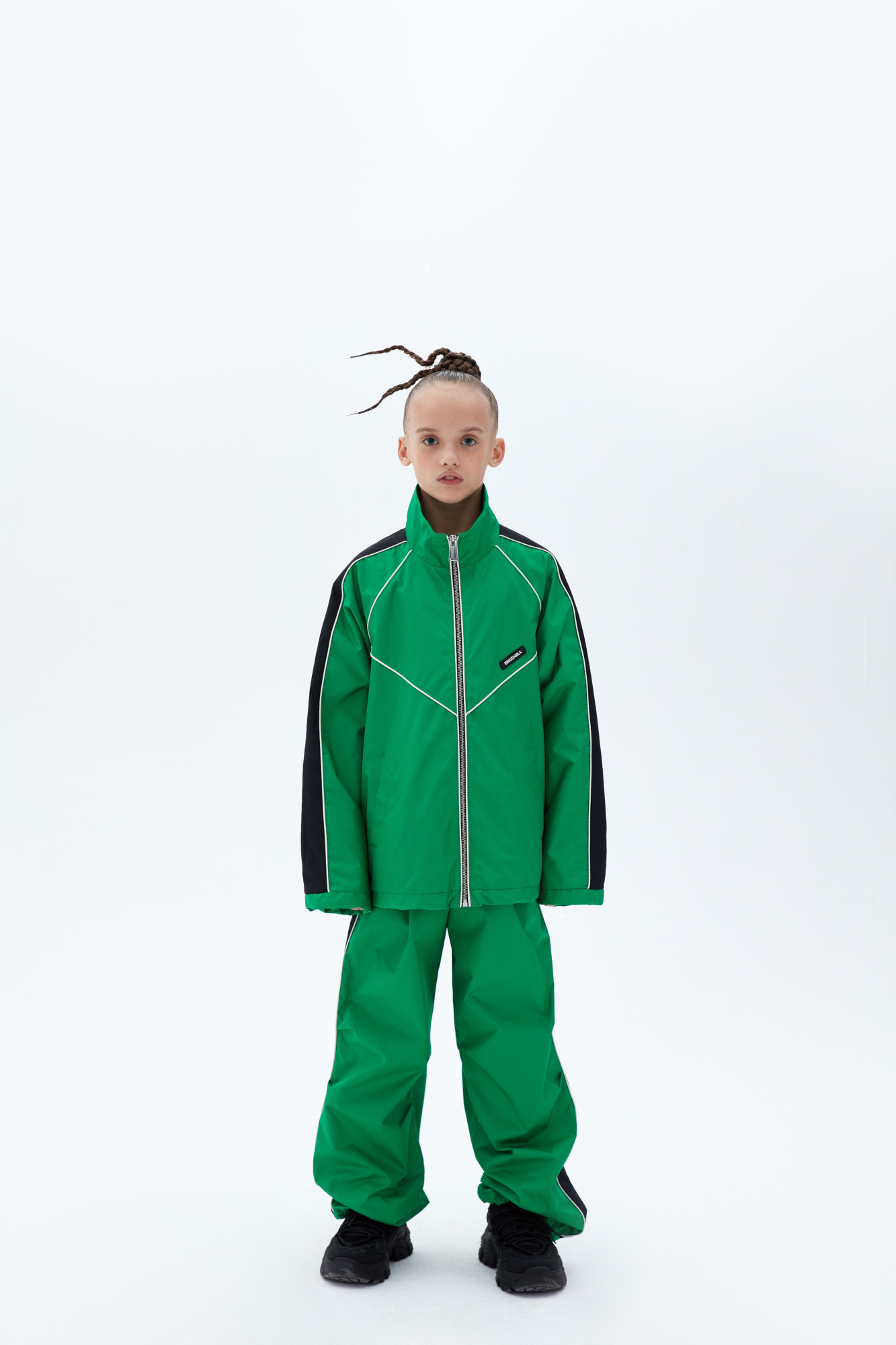 Children's jacket in a sporty style with pockets on the sides, blue piping and wide stripes. Branded label on the chest. Lined with mesh on the sides and a stand-up collar. You can complement the look with trousers or shorts in the same style.
