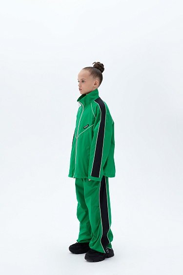 Children's jacket in a sporty style with pockets on the sides, blue piping and wide stripes. Branded label on the chest. Lined with mesh on the sides and a stand-up collar. You can complement the look with trousers or shorts in the same style.
