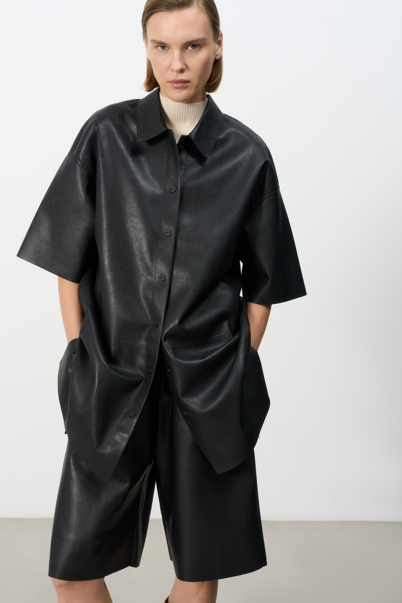 Faux leather shirt with a longline back and dropped shoulders. Unlined, button closure.