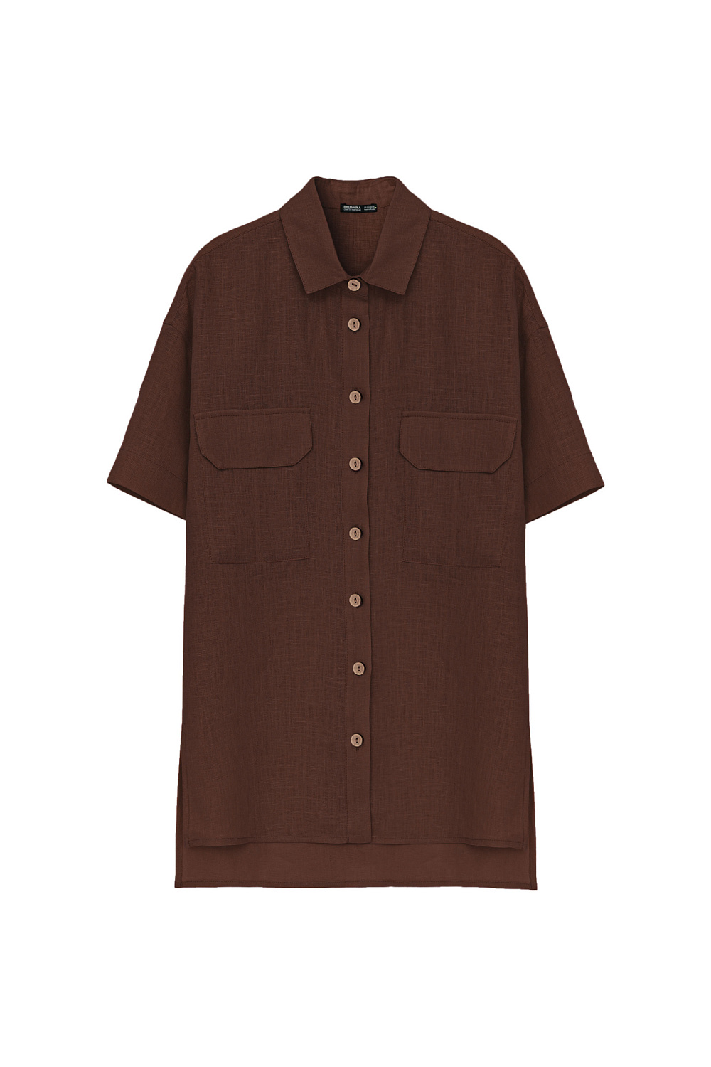 Short sleeve 100% linen shirt with patch pockets. You can complete the look with shorts and a top.