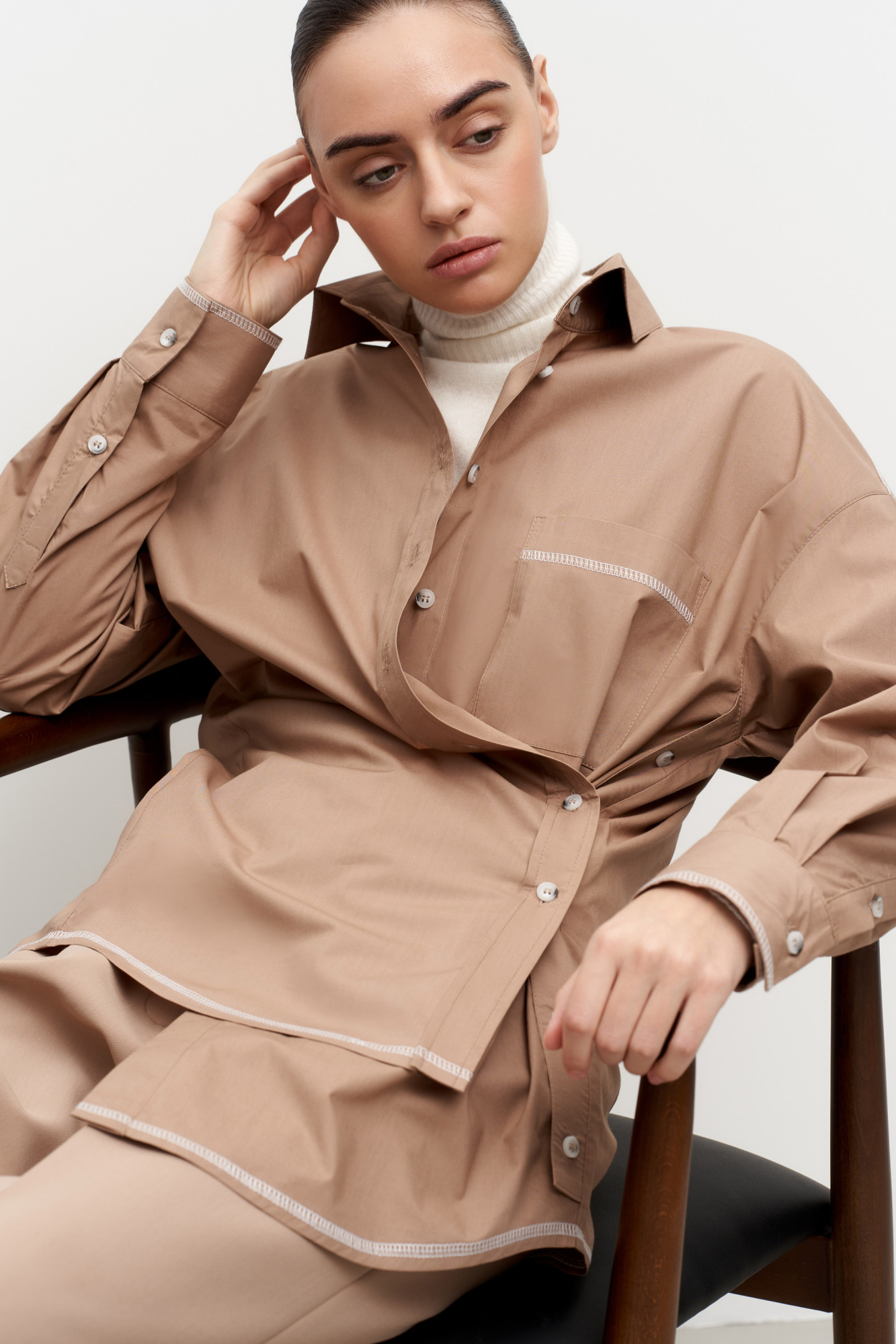 100% cotton straight-fit shirt with a patch pocket on the chest. Turn-down collar, cuffed sleeves, rounded hem. Shirt has two types of closure - a classic version and a side closure with an imitation wrap.