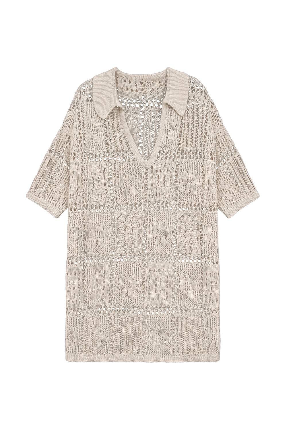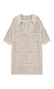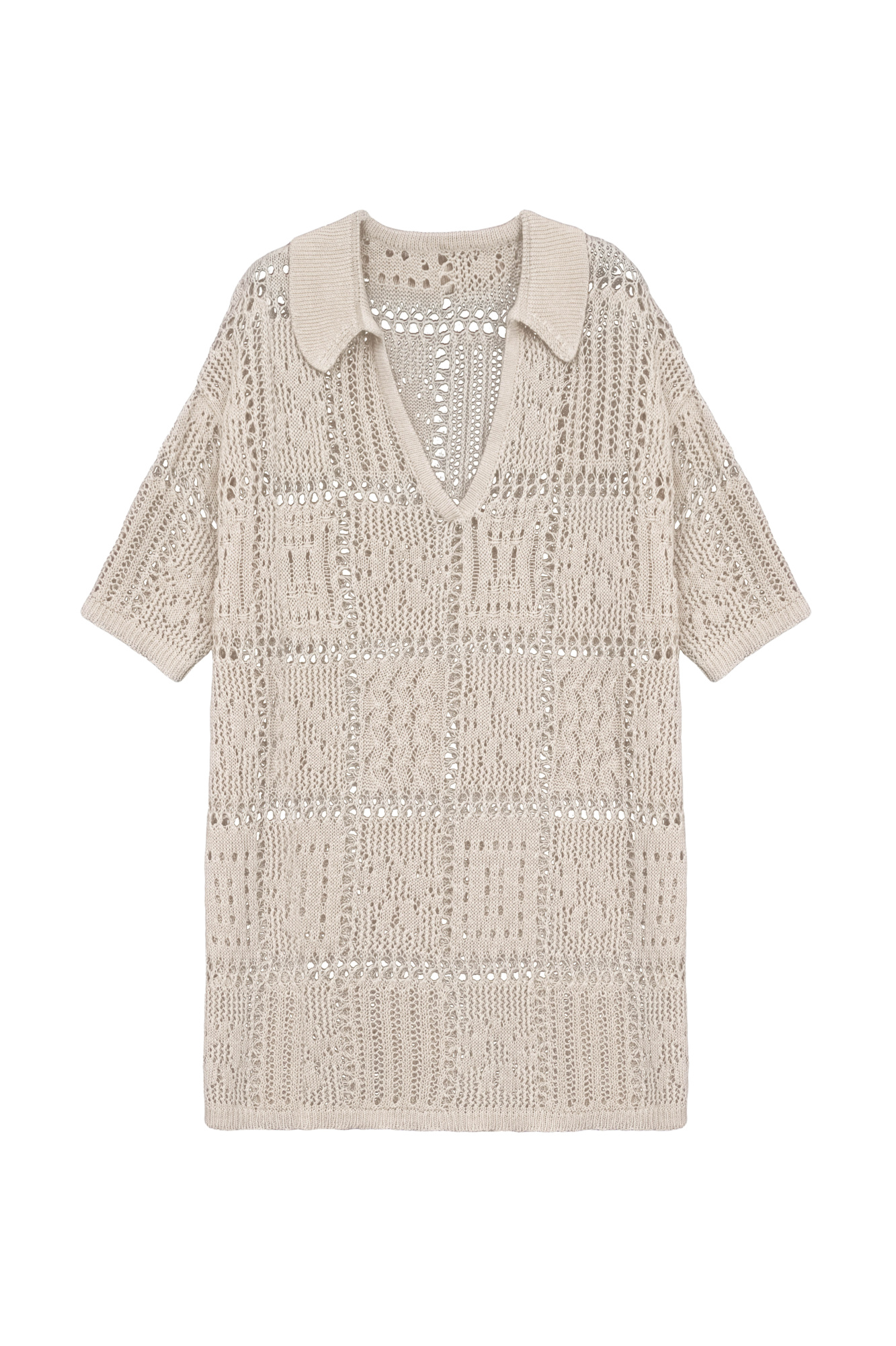 100% linen mesh knit set. Shirt with dropped shoulders, V-neck and polo collar. Cropped shorts with an elastic ribbed waistband.