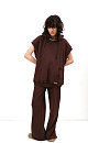 Vest with a hood, a stitched belt at the bottom of the vest made of footer, a patch pocket. The trousers are loose-fitting, straight, with a stitched elasticated waistband and slits at the back.