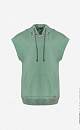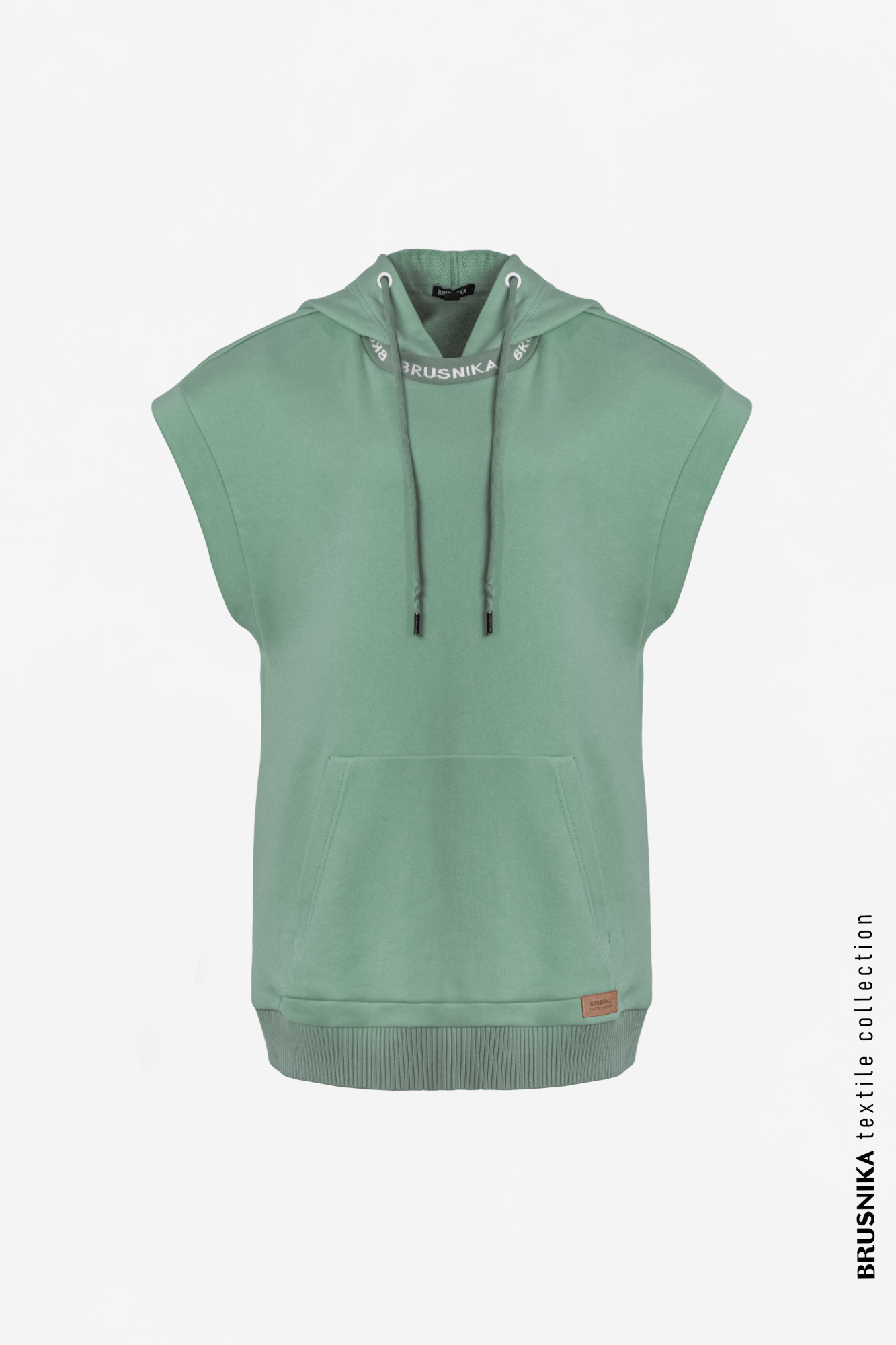 Vest with a hood, a stitched belt at the bottom of the vest made of footer, a patch pocket. The trousers are loose-fitting, straight, with a stitched elasticated waistband and slits at the back.