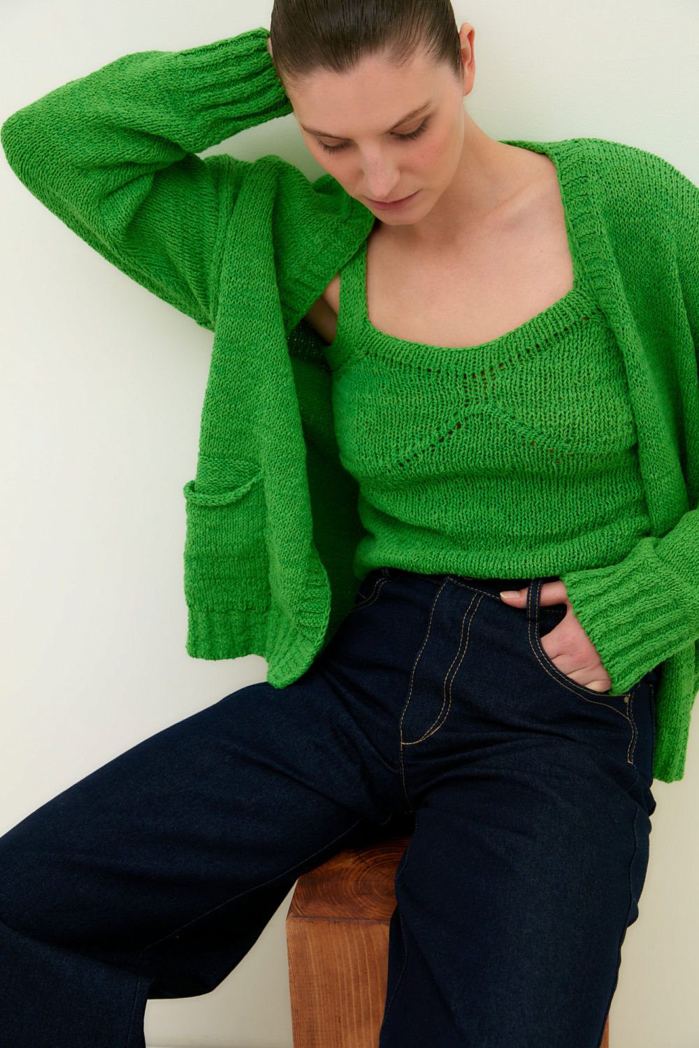 Knitted top with straps with an accent bust line.