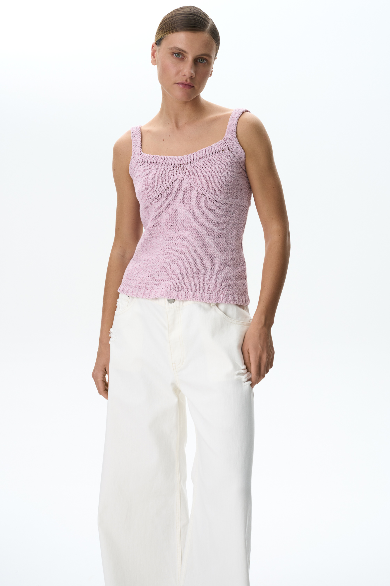 Knitted top with straps with an accent bust line.