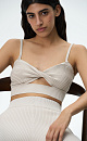 Knit top with twist front and thin straps.Wide elastic at the bottom for a tight fit on the body.