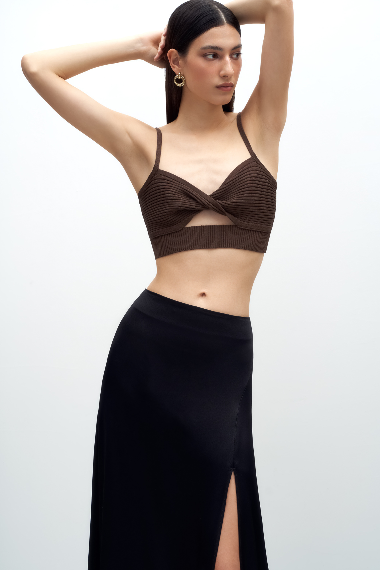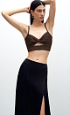 Knit top with twist front and thin straps.Wide elastic at the bottom for a tight fit on the body.