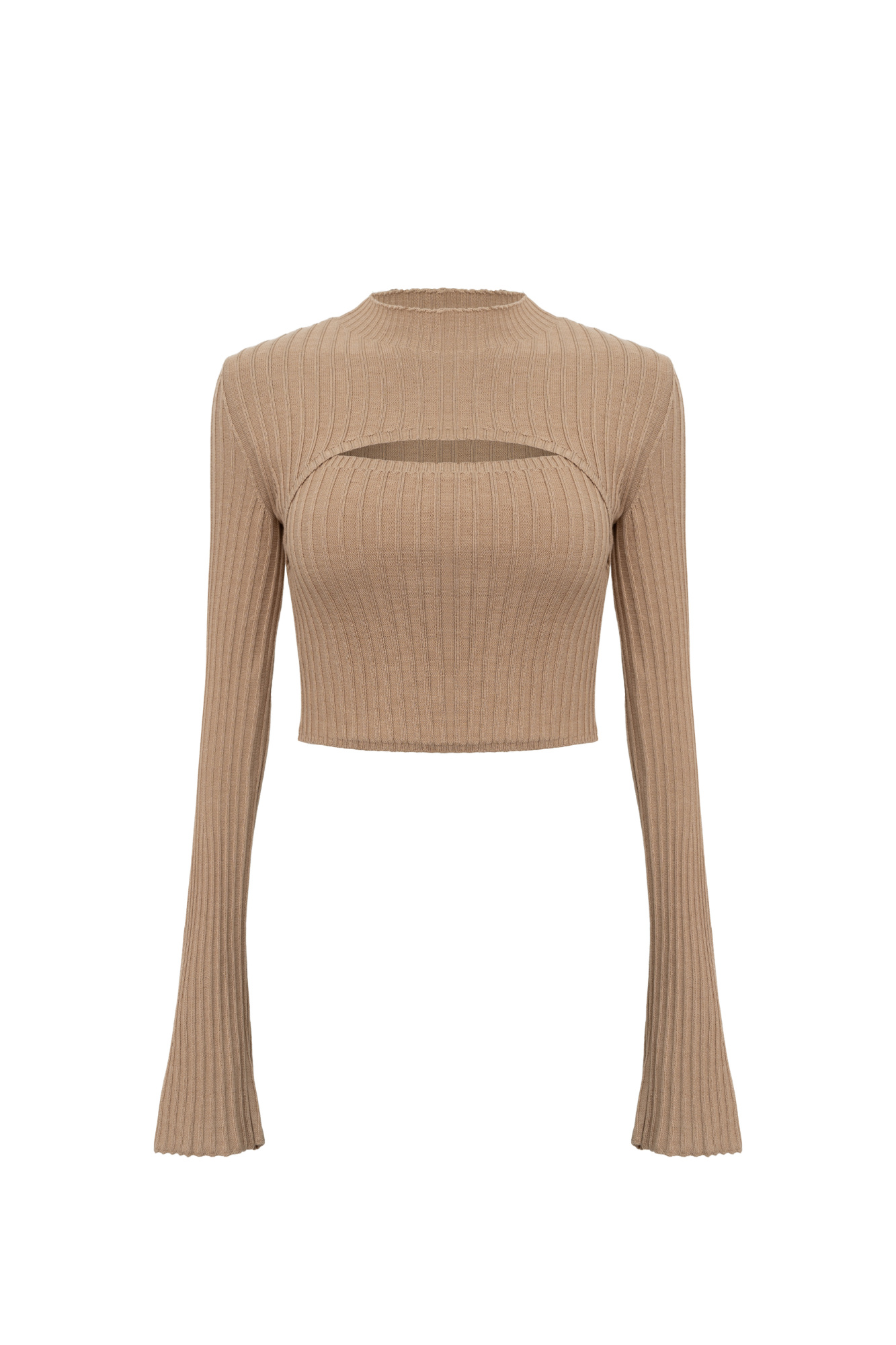 Knitted top made of extrafine merino wool. Fitted with long flared sleeves and an accent cutout at the chest.