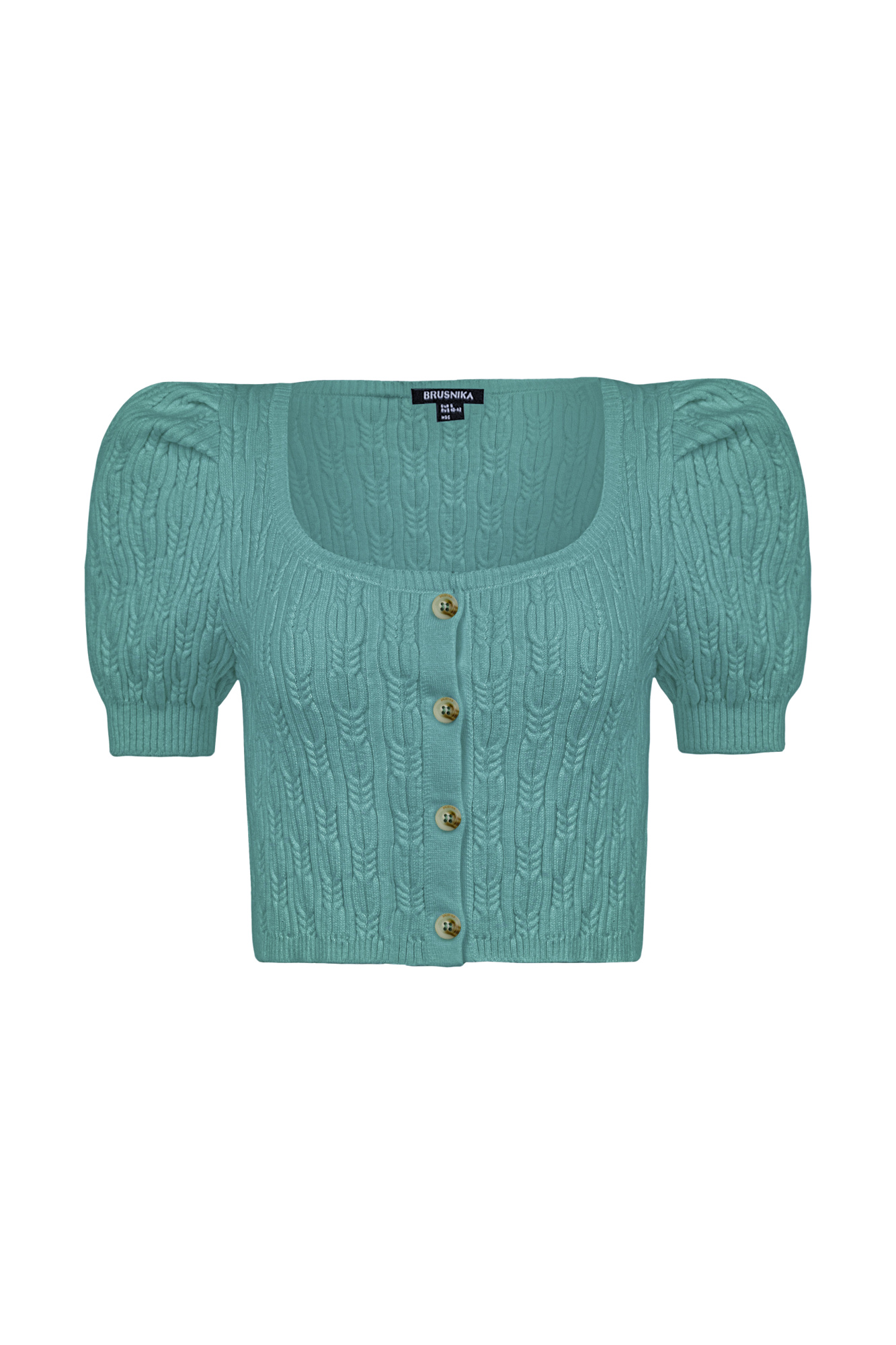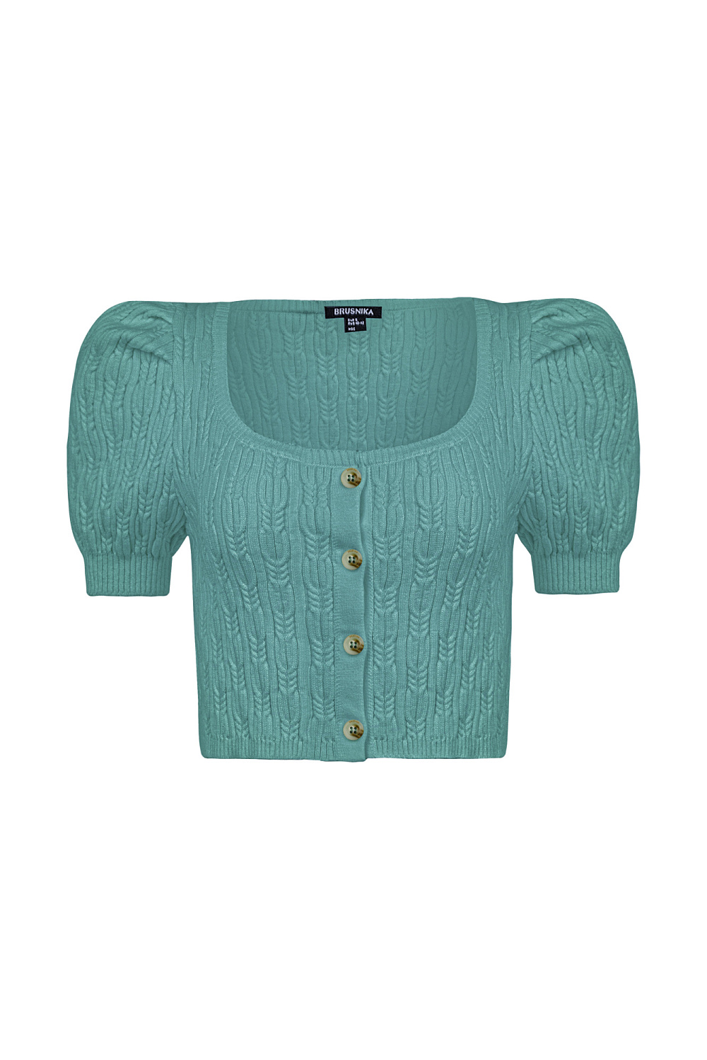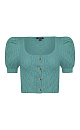 Cotton and viscose blend knit top with short puff sleeves and button closure.