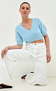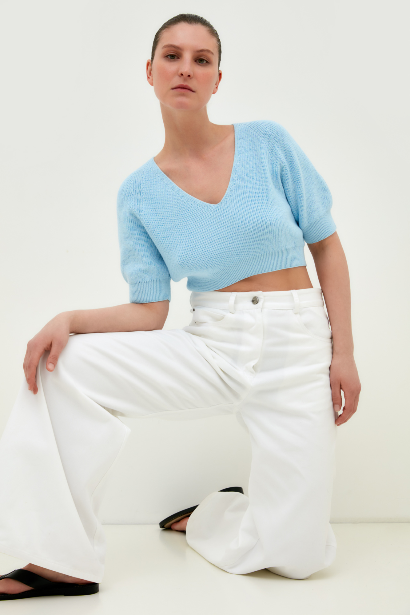 Cotton knit top with V-neck and short sleeves. Ribbed cuffs and hem.