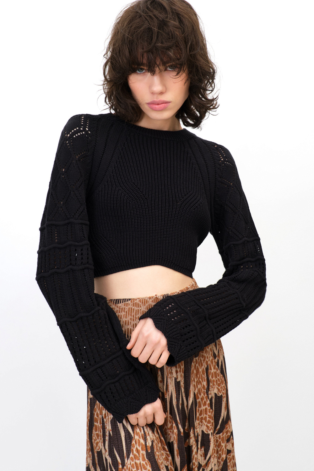 Textured cotton knit top with long sleeves.You can complete the look with a skirt in the same style.