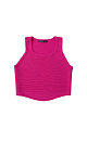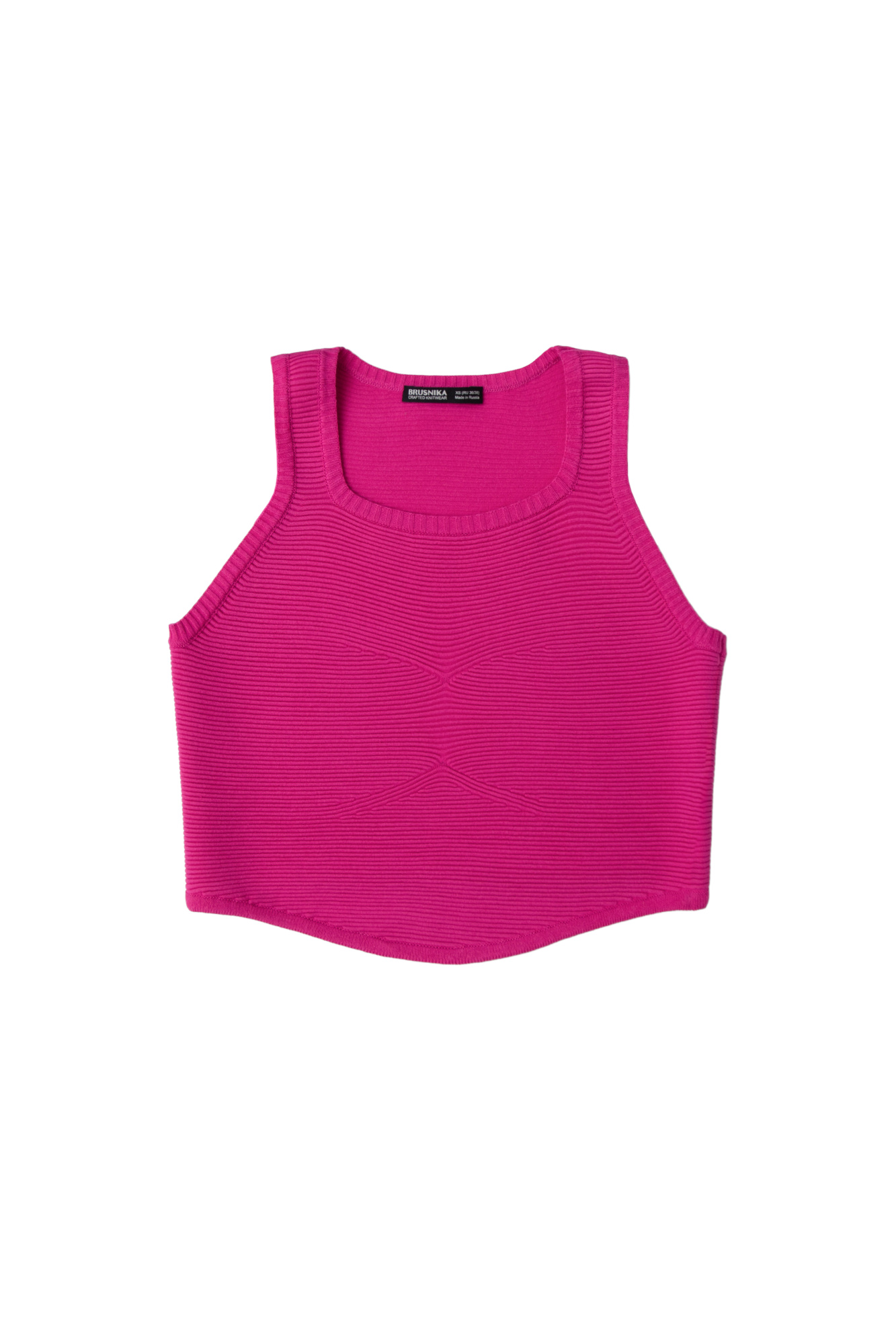 Knitted visose top. The model has a fitted silhouette with a figured hem, sleeveless, and wide straps. The product is made with a horizontal rib.