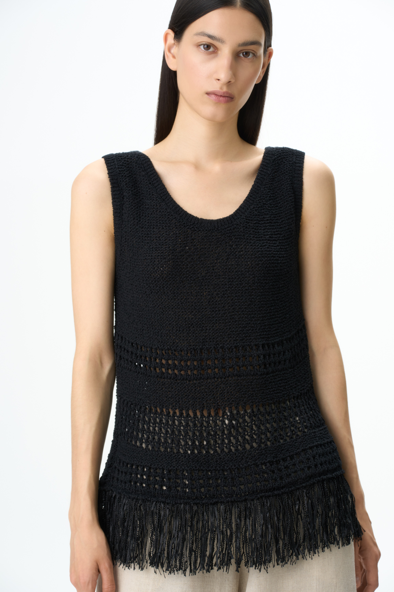 Knitted top with fringed bottom. You can complete the look with a matching skirt.