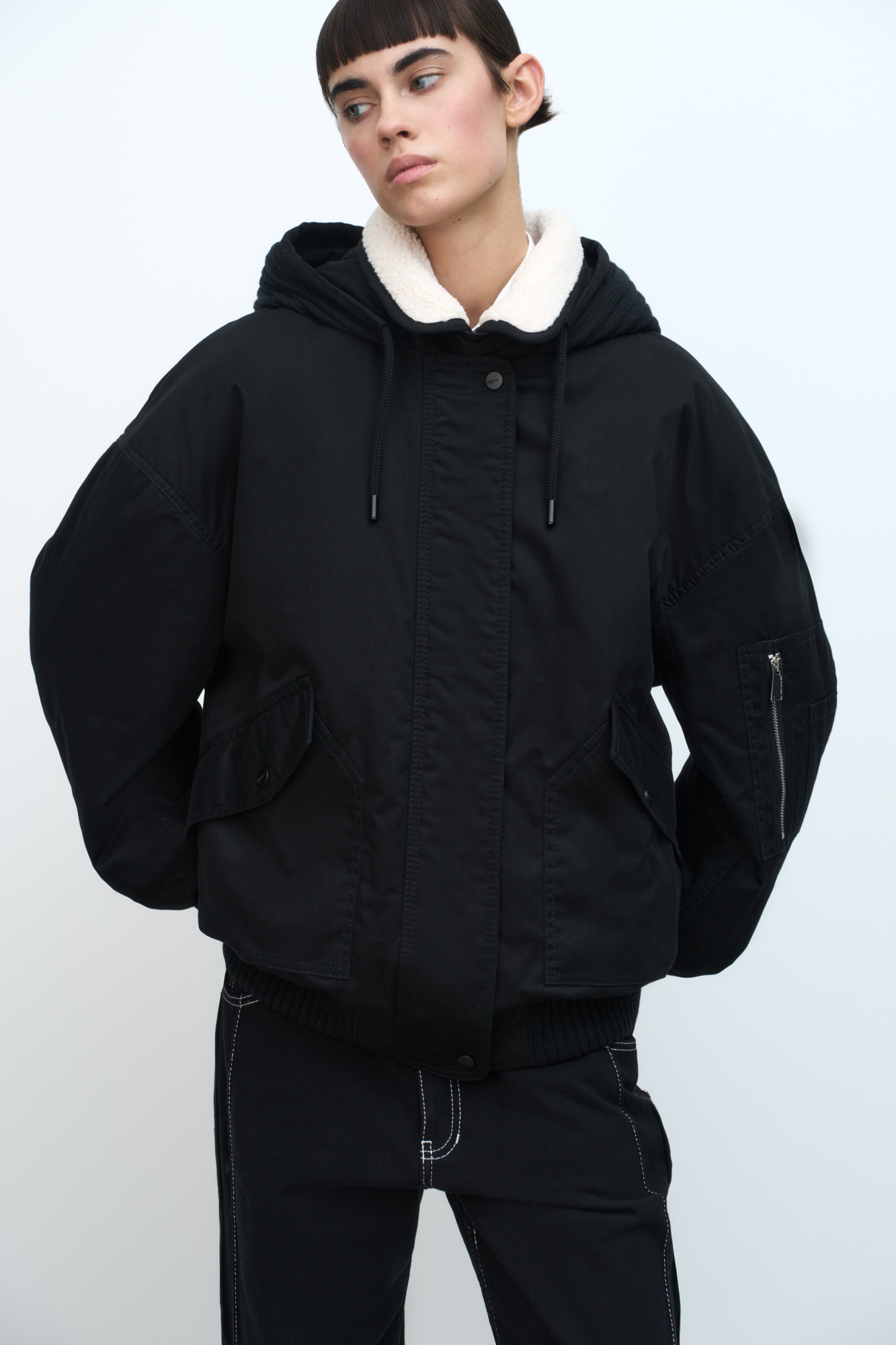 Cotton bomber jacket with a knitted hood and pockets. High collar with flap. Cuffs, elasticated hem and hood with drawstring. Front zip and snap bottons closure.