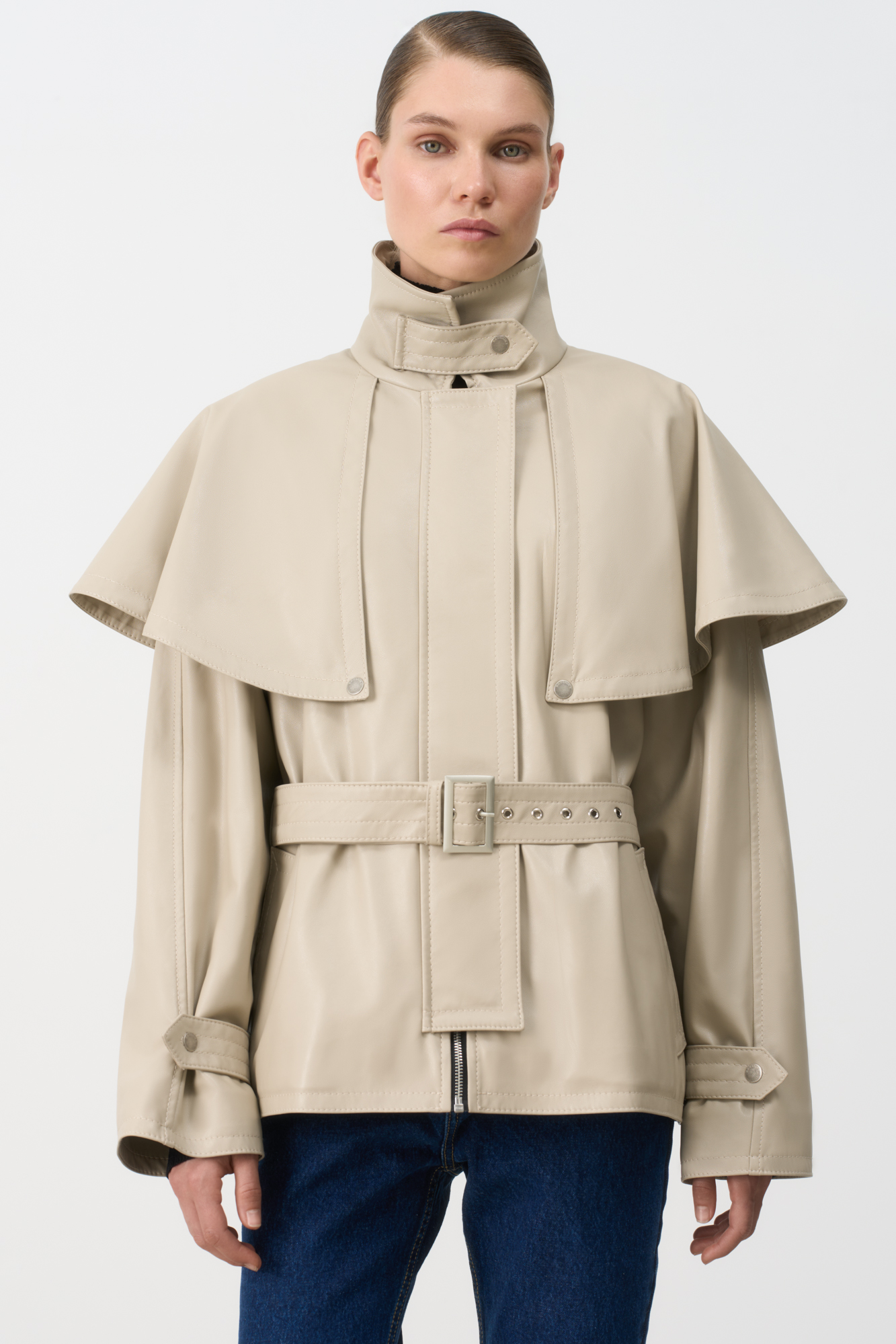 Jacket with asymmetrical flap. The model has a loose silhouette with a stand-up collar, side pockets and patches on the cuffs. Belt to match the product. Lined.