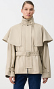 Jacket with asymmetrical flap. The model has a loose silhouette with a stand-up collar, side pockets and patches on the cuffs. Belt to match the product. Lined.