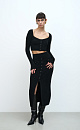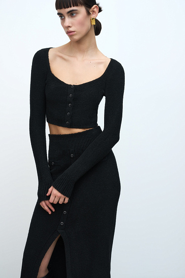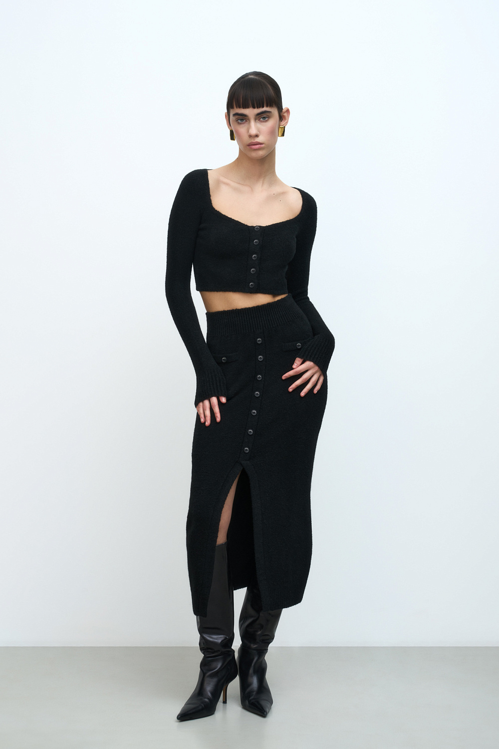 Wool blend bouclé skirt. Features straight silhouette with a front slit, decorated with buttons.