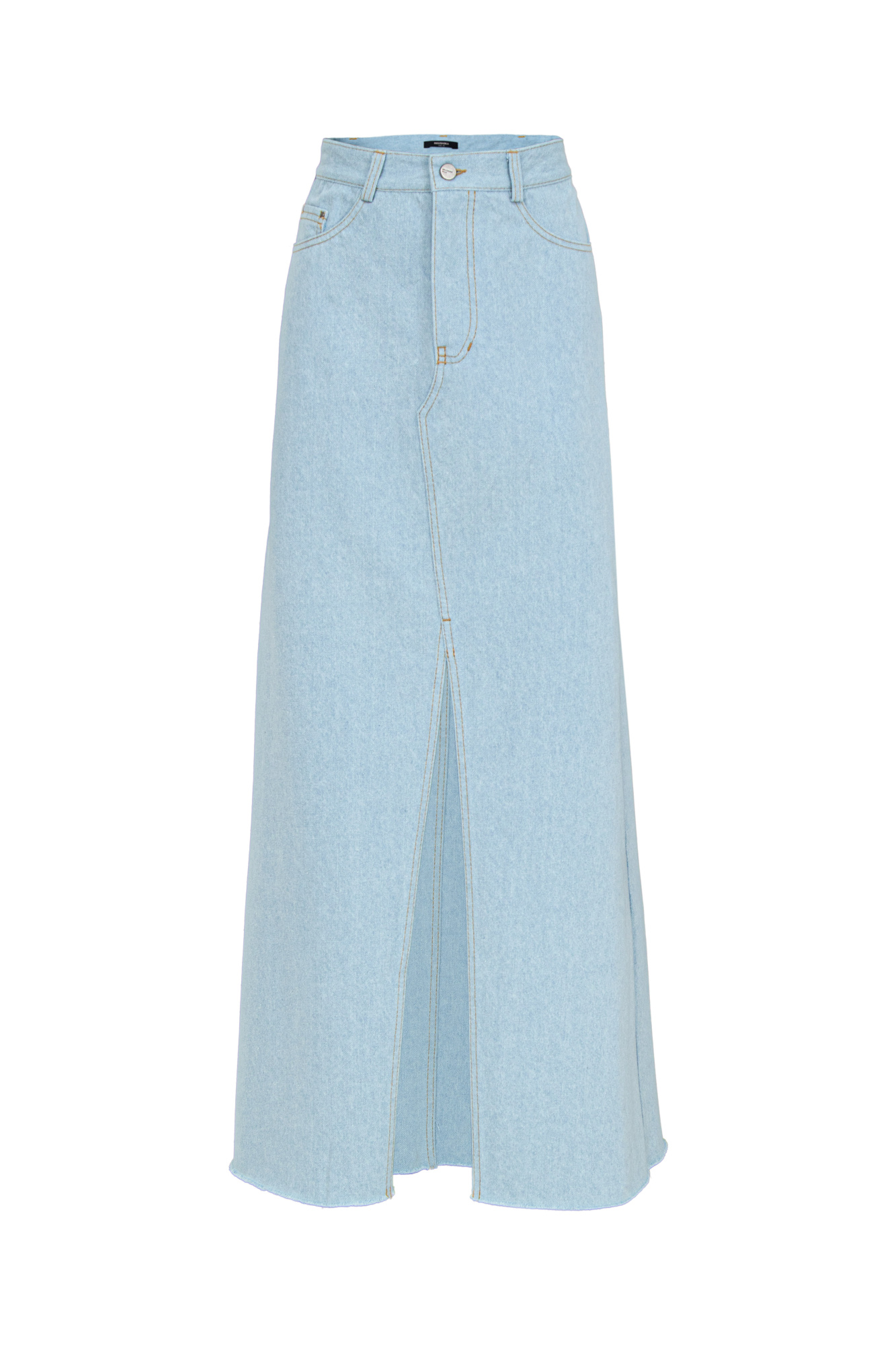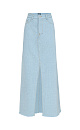 100% cotton denim maxi skirt with a front slit and raw hem. The skirt can be used to style mid-season looks.